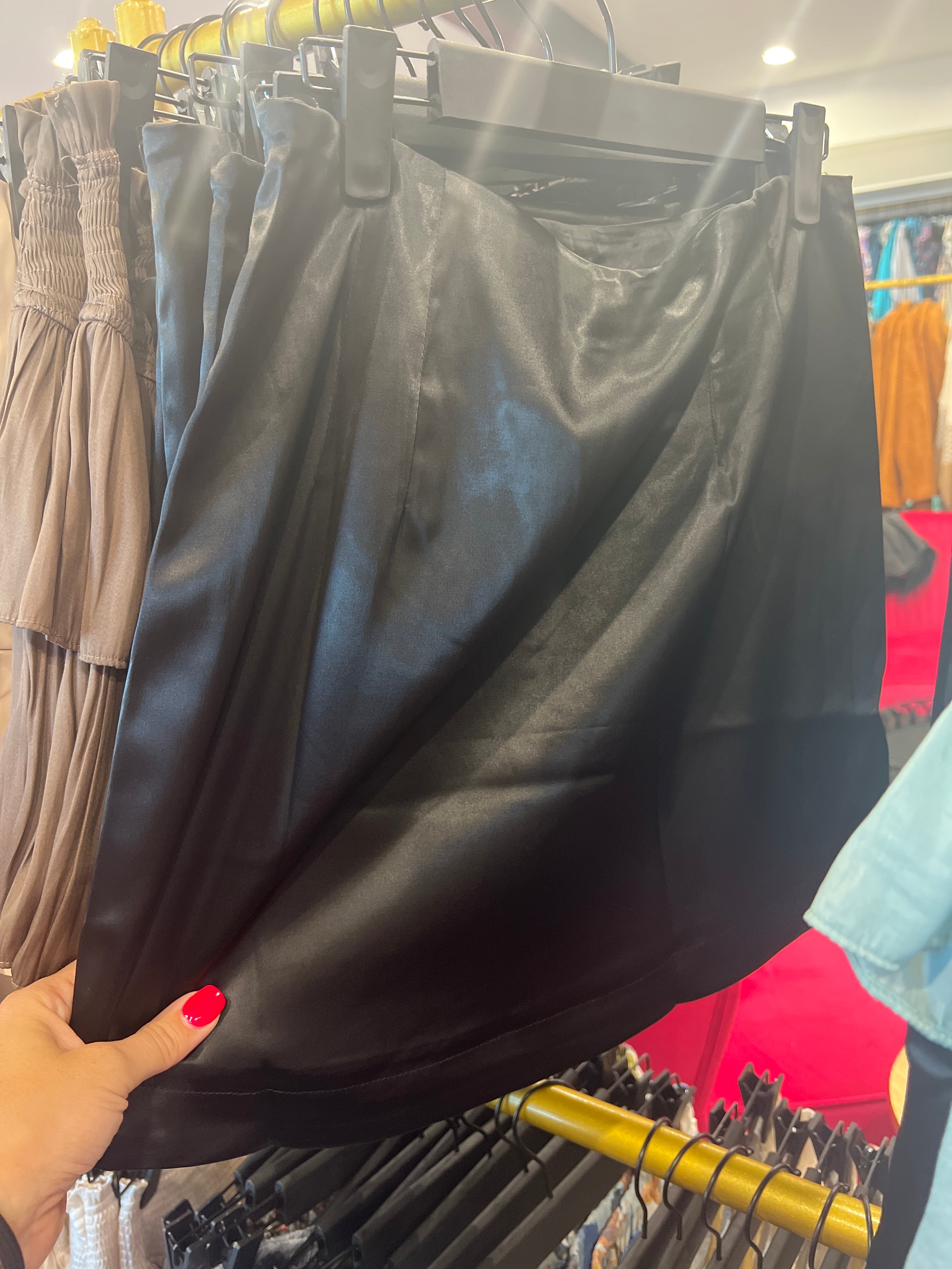 Solid satin skirt featuring zip closure at side. Lined. Woven. Non-sheer. Lightweight.