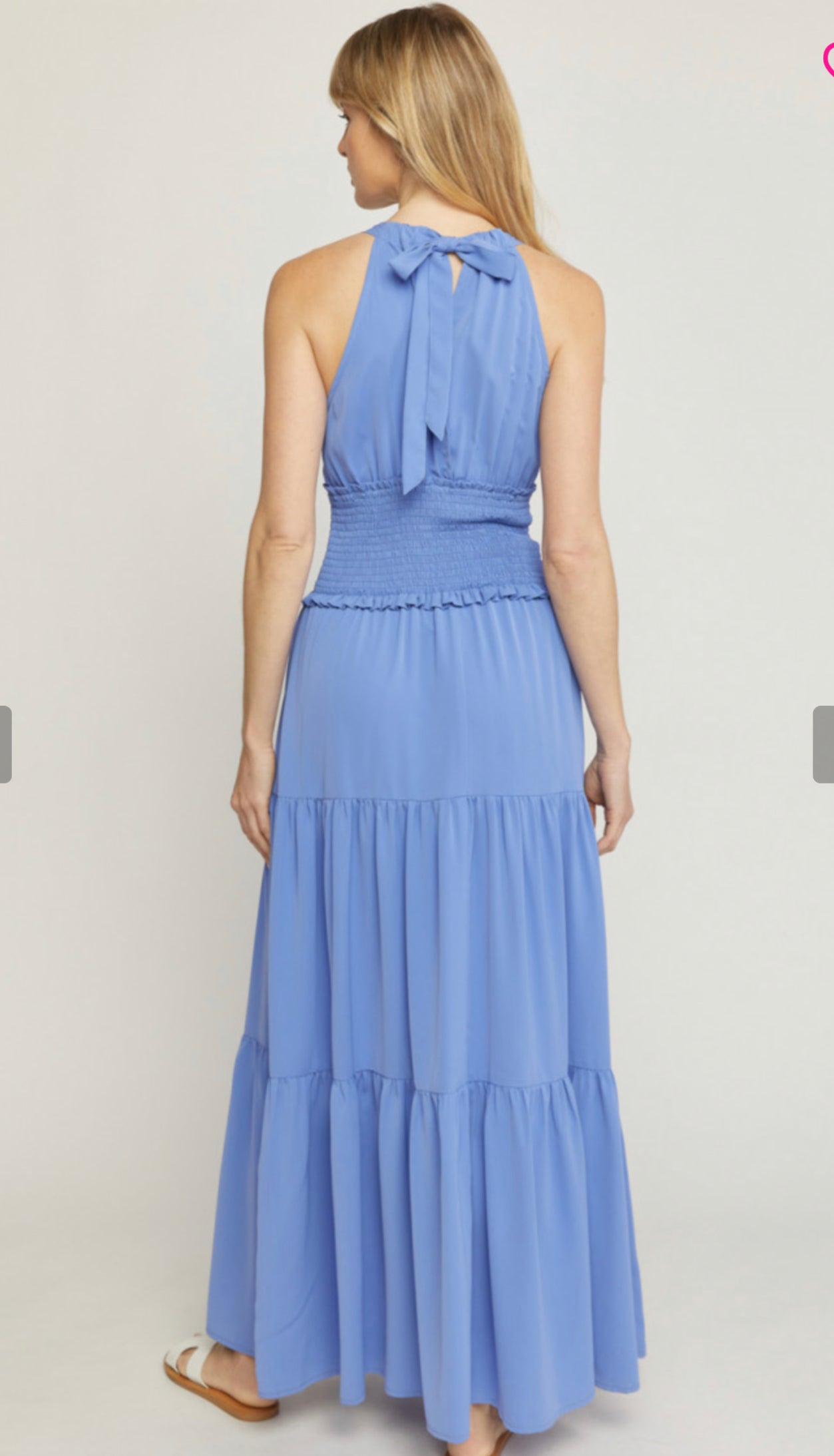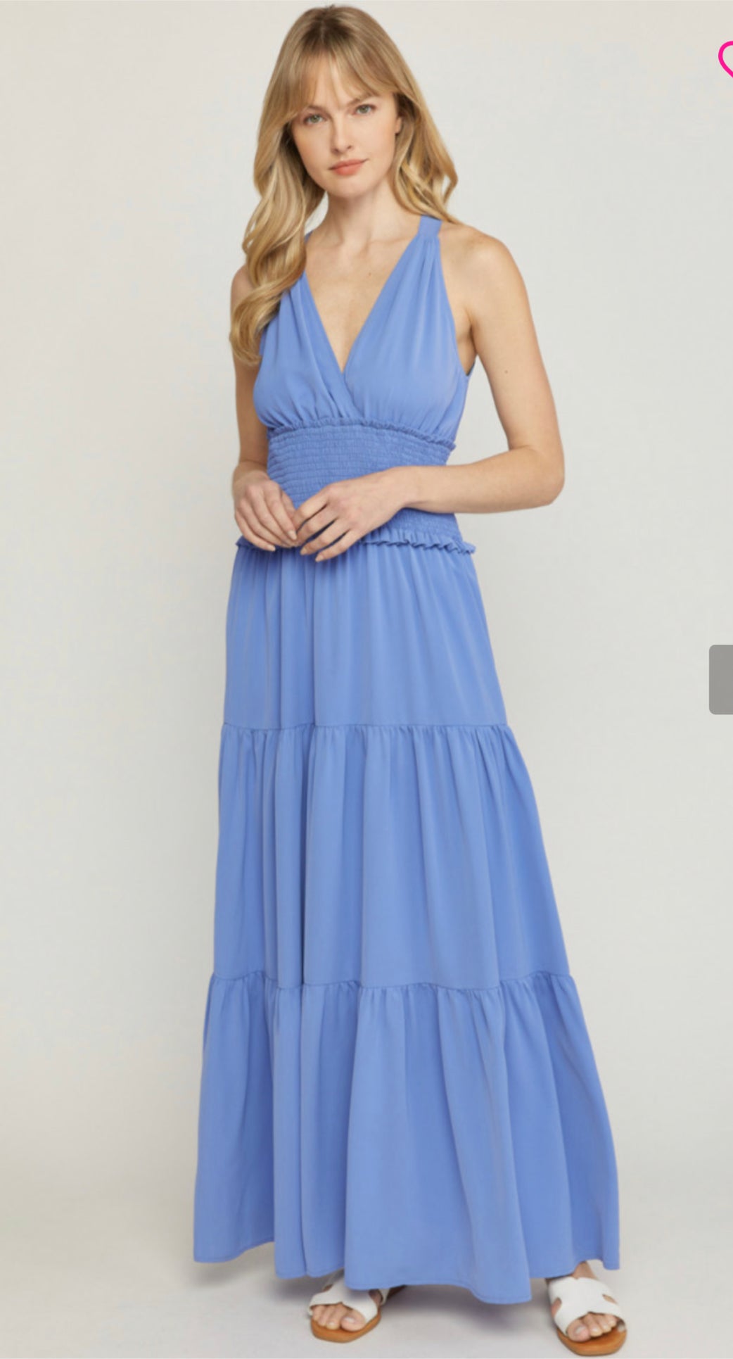 Solid v-neck sleeveless tiered maxi dress featuring smocking at waist. Self tie closure at back neck. Lined. Woven. Non-sheer. Lightweight.