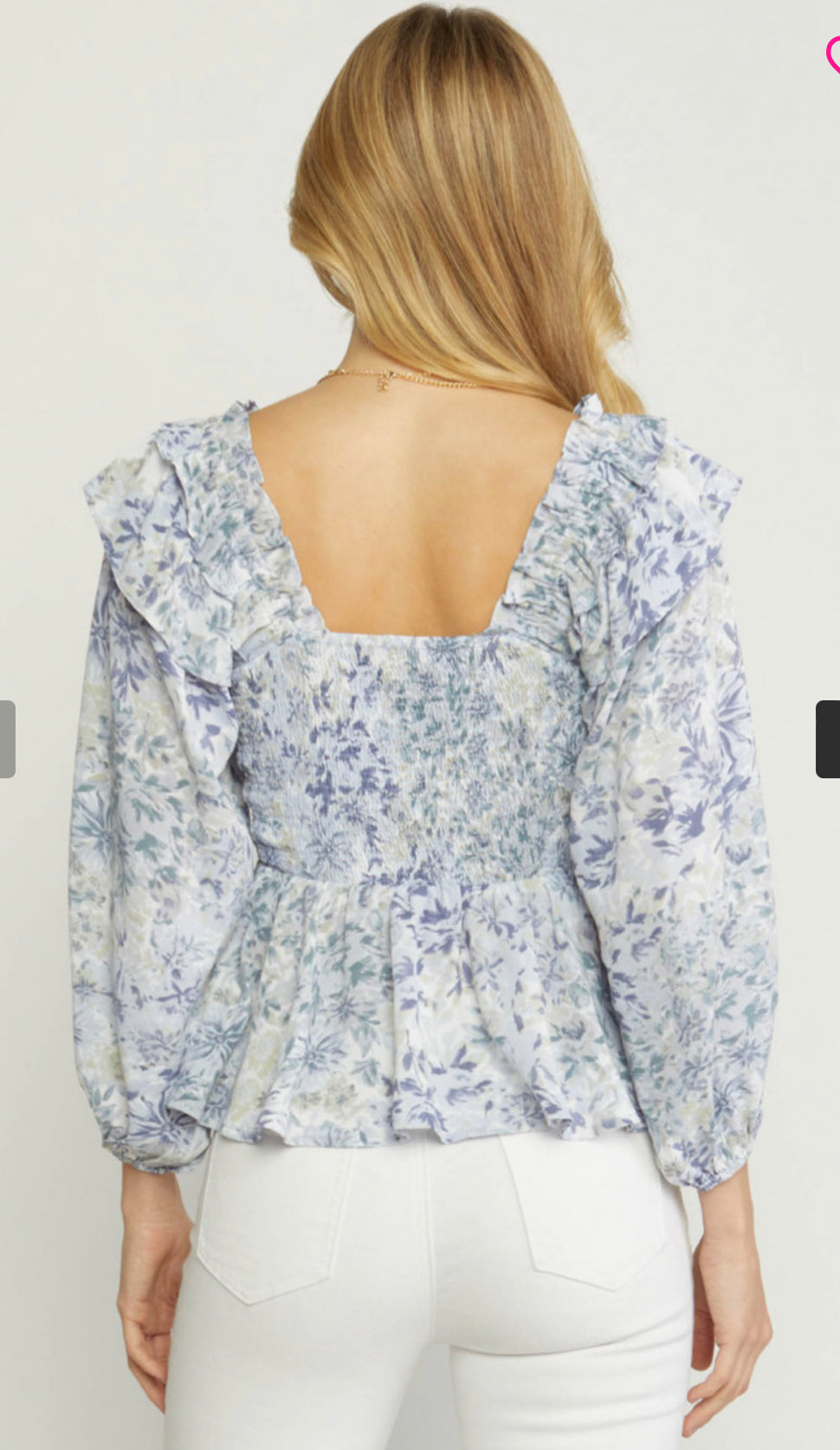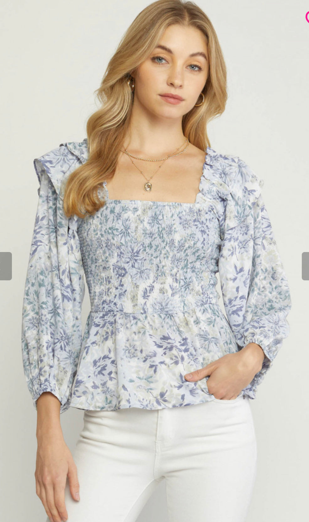 Floral print square neck long sleeve peplum top featuring smocking at bust. Ruffle detail at shoulders. Unlined. Woven. Non-sheer. Lightweight.