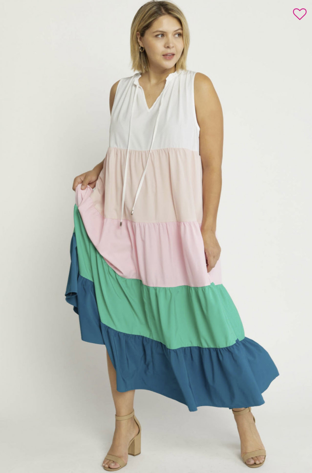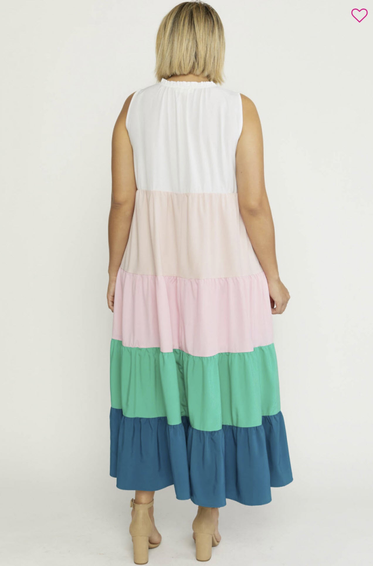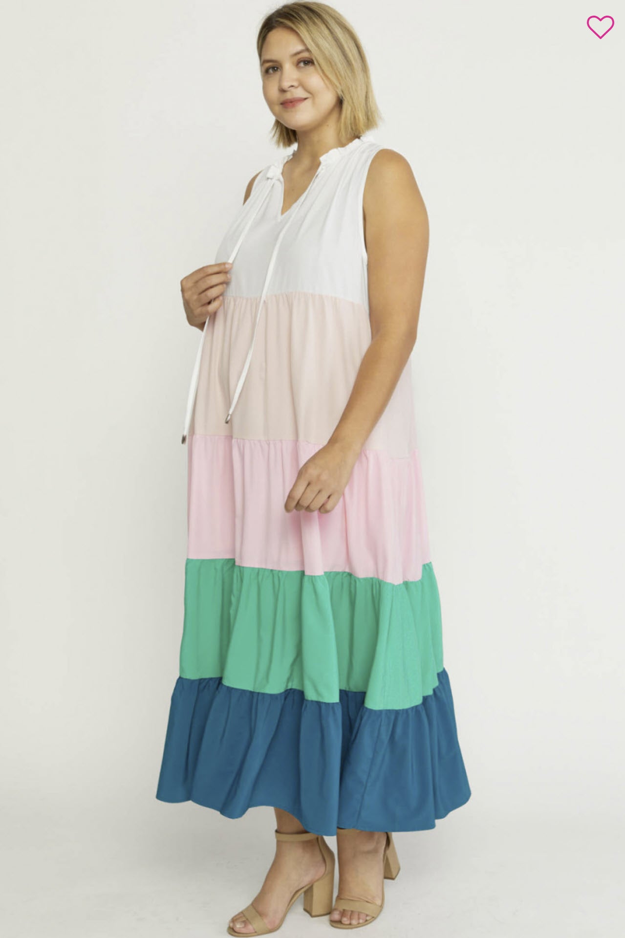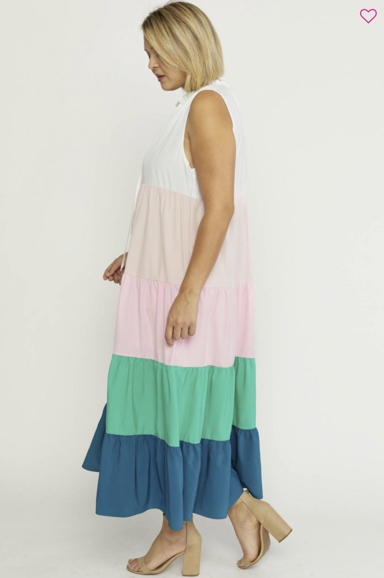 Colorblock sleeveless maxi dress featuring pockets at sides. Ruffle detail and self tie closure at neckline. Lined. Woven. Non-sheer. Lightweight.