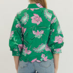 Floral print long sleeve top featuring scallop hem and V-neck band collar. Buttoned cuffs. Unlined. Woven. Non-sheer. Lightweight.