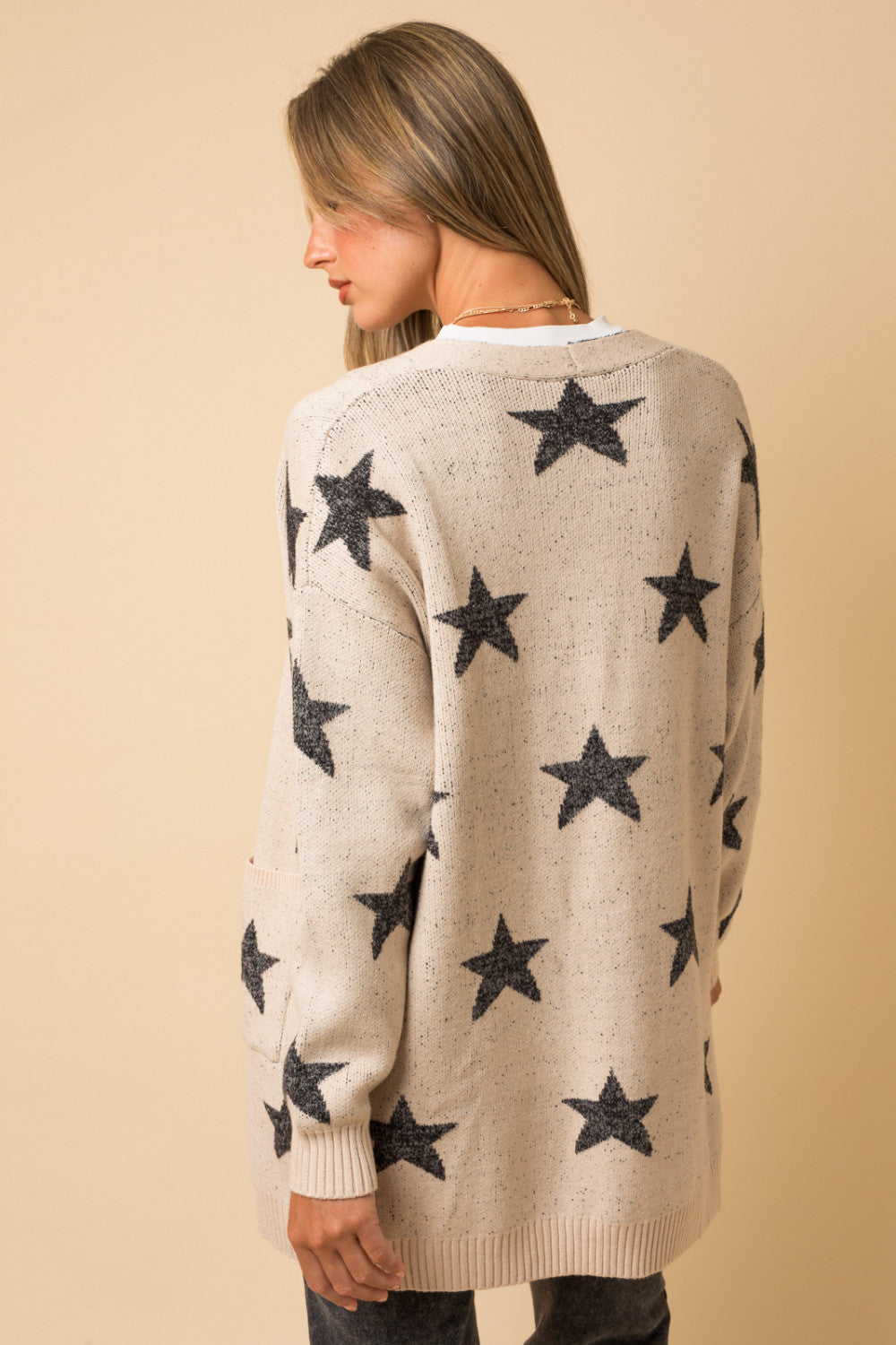 OATMEAL LONG SLEEVE FRONT POCKET STAR SWEATER CARDIGAN