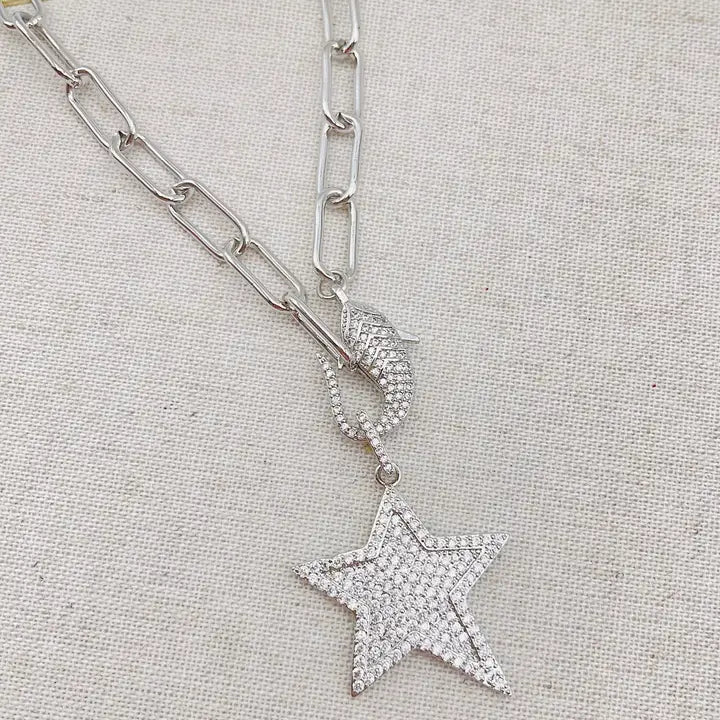 Dress up your favorite outfit with our star feather necklace in silver. This necklace offers a gemstone encrusted star hanging at the bottom. The delicate chain adds a touch of refinement, while the dazzling gemstones capture the essence of starlight.