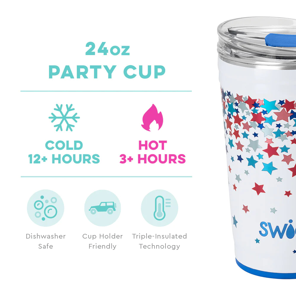 Party-Ready! 🥳🥤 O say, can you see? Eye-catching stars of red and blue fall over a glitter base in this patriotic party print.