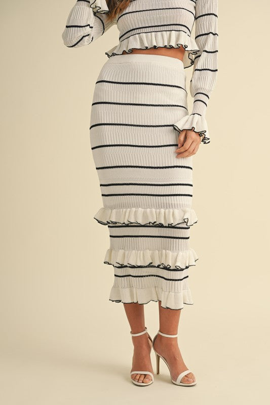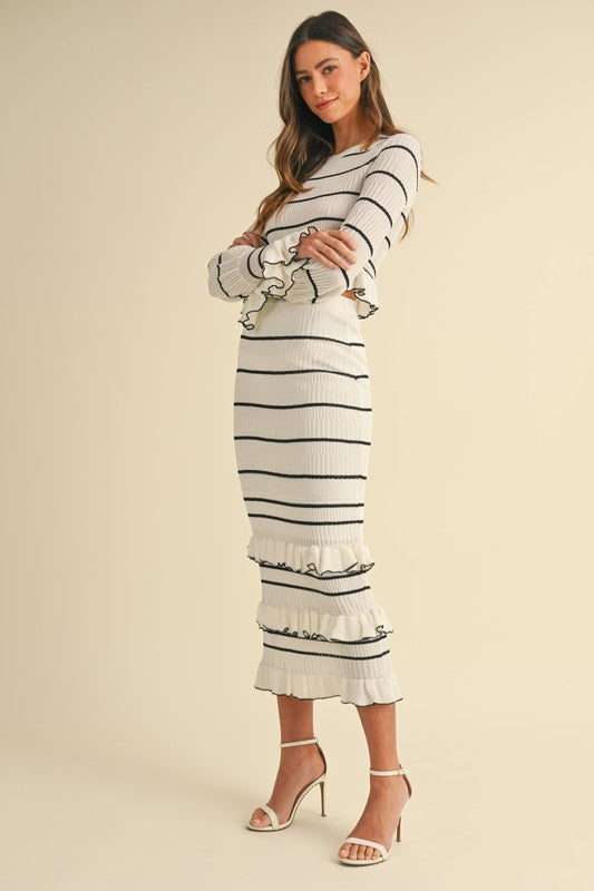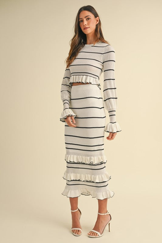 This set is all about adding some fun and flirty flair to your wardrobe! The long-sleeve peplum crop top features a cute striped pattern and a ruffle hem that gives it a playful, feminine touch. The peplum style creates a flattering silhouette, while the matching midi skirt completes the look with its sleek, yet breezy feel. The skirt is lined for extra comfort and a smooth fit. Whether you're dressing it up for a night out or keeping it casual for brunch, this set strikes the perfect balance of style and ease!