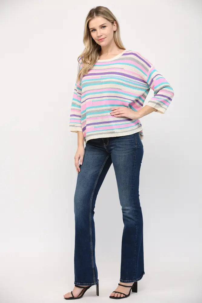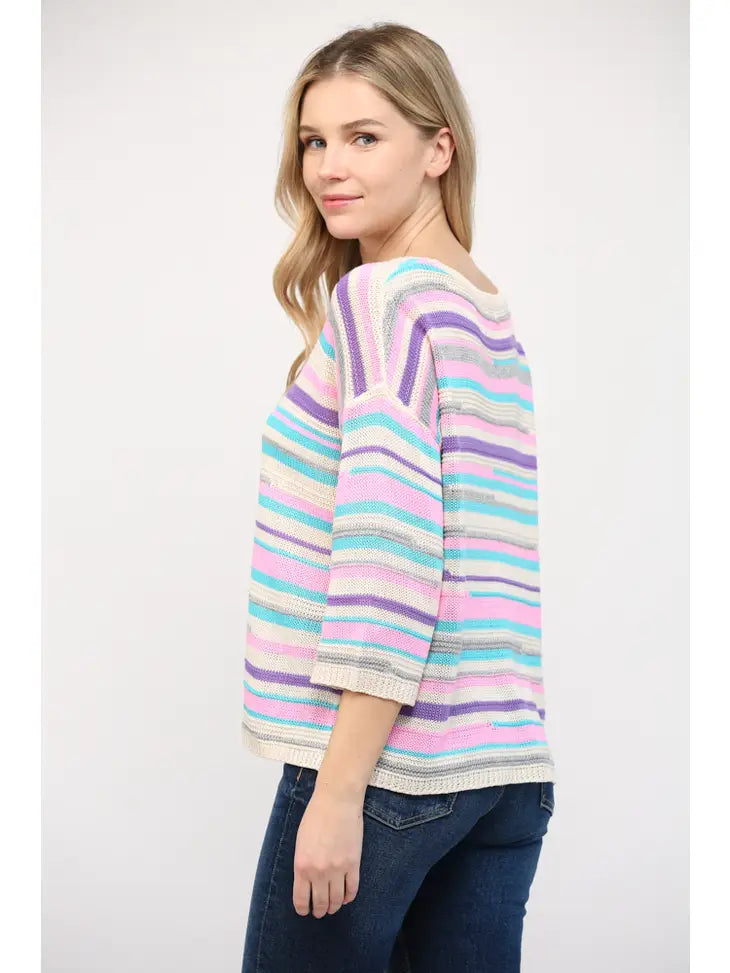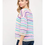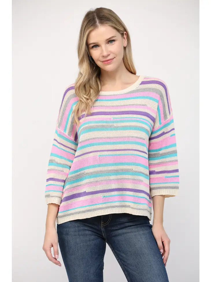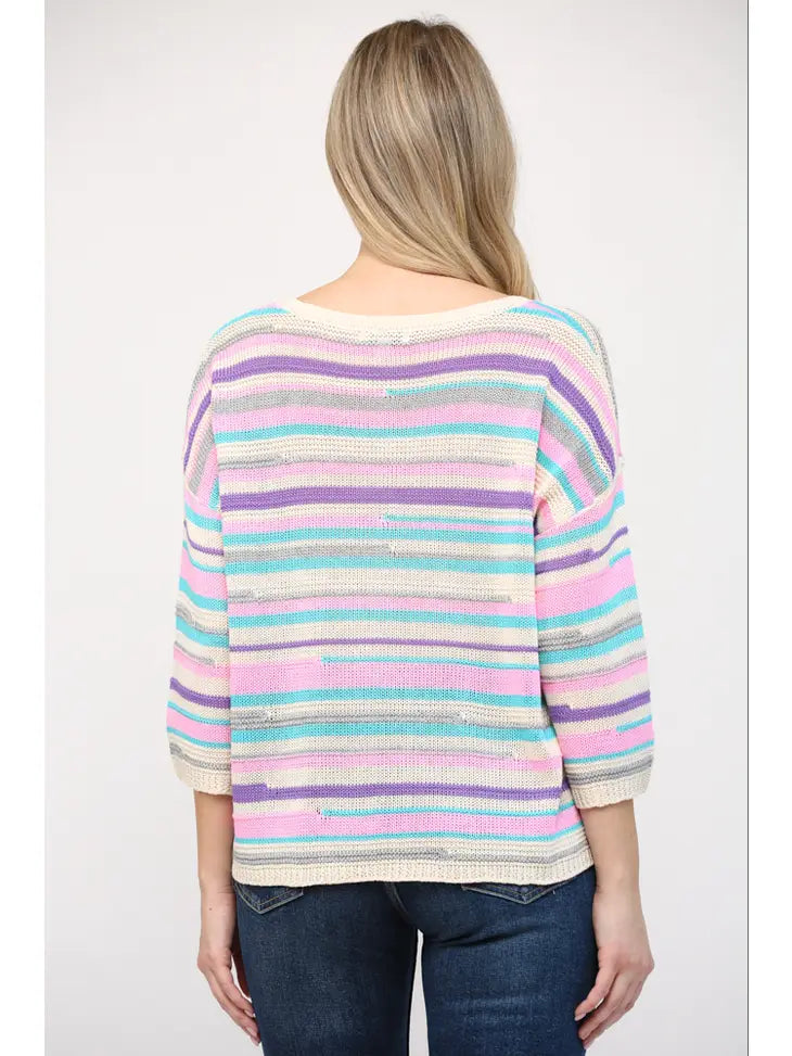 Stripe open knit 3/4 sleeve sweater 100%polyester