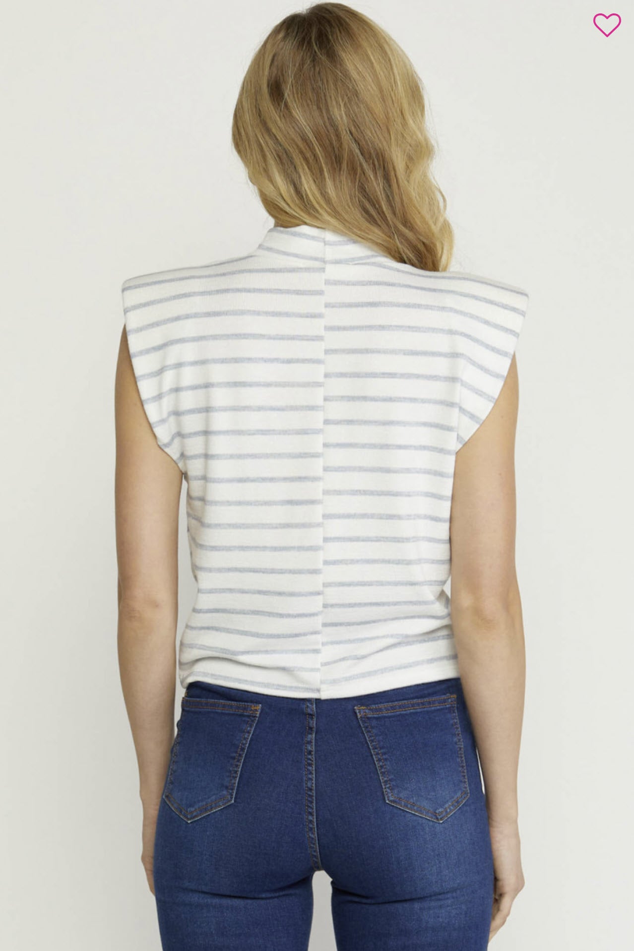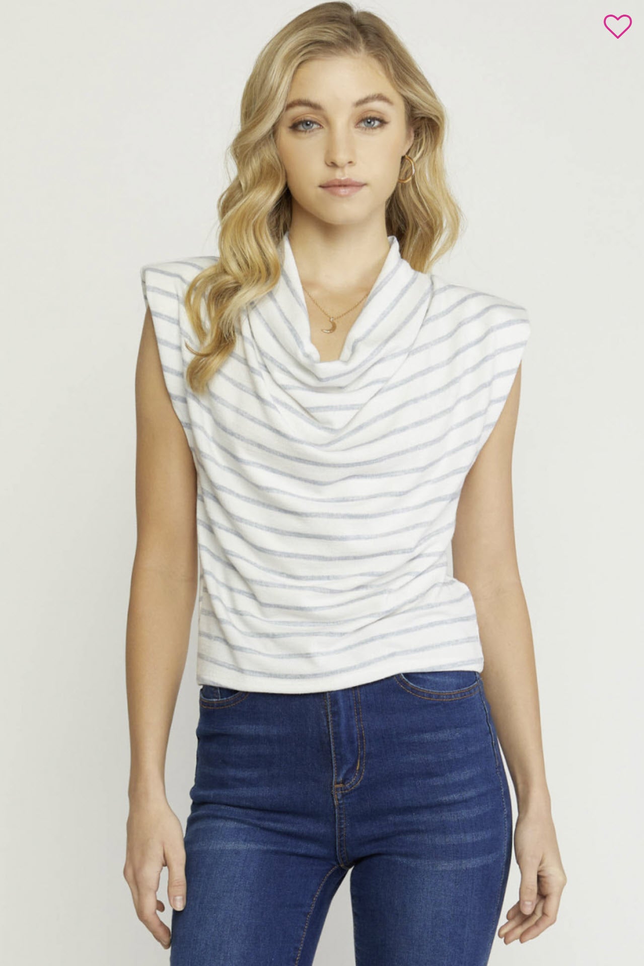 Stripe print cowl neck sleeveless top featuring shoulder pads. Unlined. Knit. Non-sheer. Lightweight.