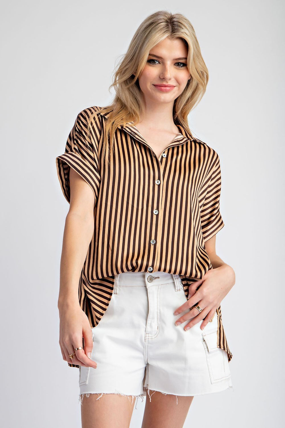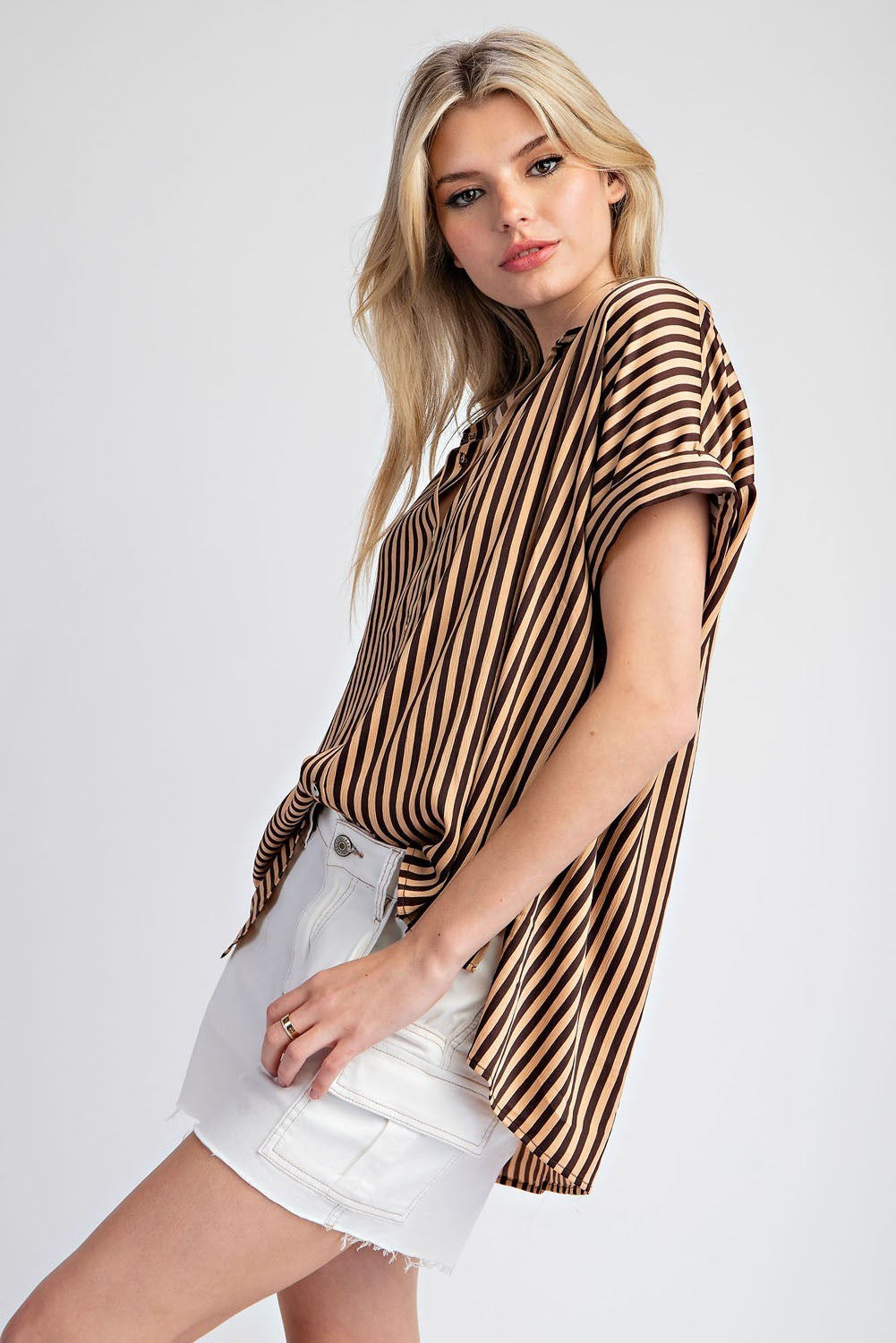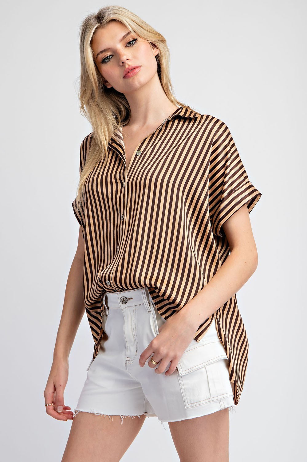 This striped short sleeve blouse is the perfect blend of casual and polished. Featuring a classic button-down front and collared neckline, it’s a great option for both workdays and weekends. The two side slits give it a high-low design that adds a trendy touch, while the added pinching in the back adds a little extra detail to keep it interesting. With its loose fit, it’s comfortable and breezy, making it ideal for staying cool while still looking effortlessly chic. Pair it with jeans, trousers, or shorts for an easy, versatile look that works any day of the week.