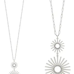 Discover the latest in fashion jewelry with the Silver Sunburst with Rhinestone Drop 32" Necklace. This pendant/charm necklace is a must-have accessory. Its unique sunburst design coupled with a rhinestone drop offers a perfect blend of style and elegance. Add a touch of sparkle to your outfit with this eye-catching piece.