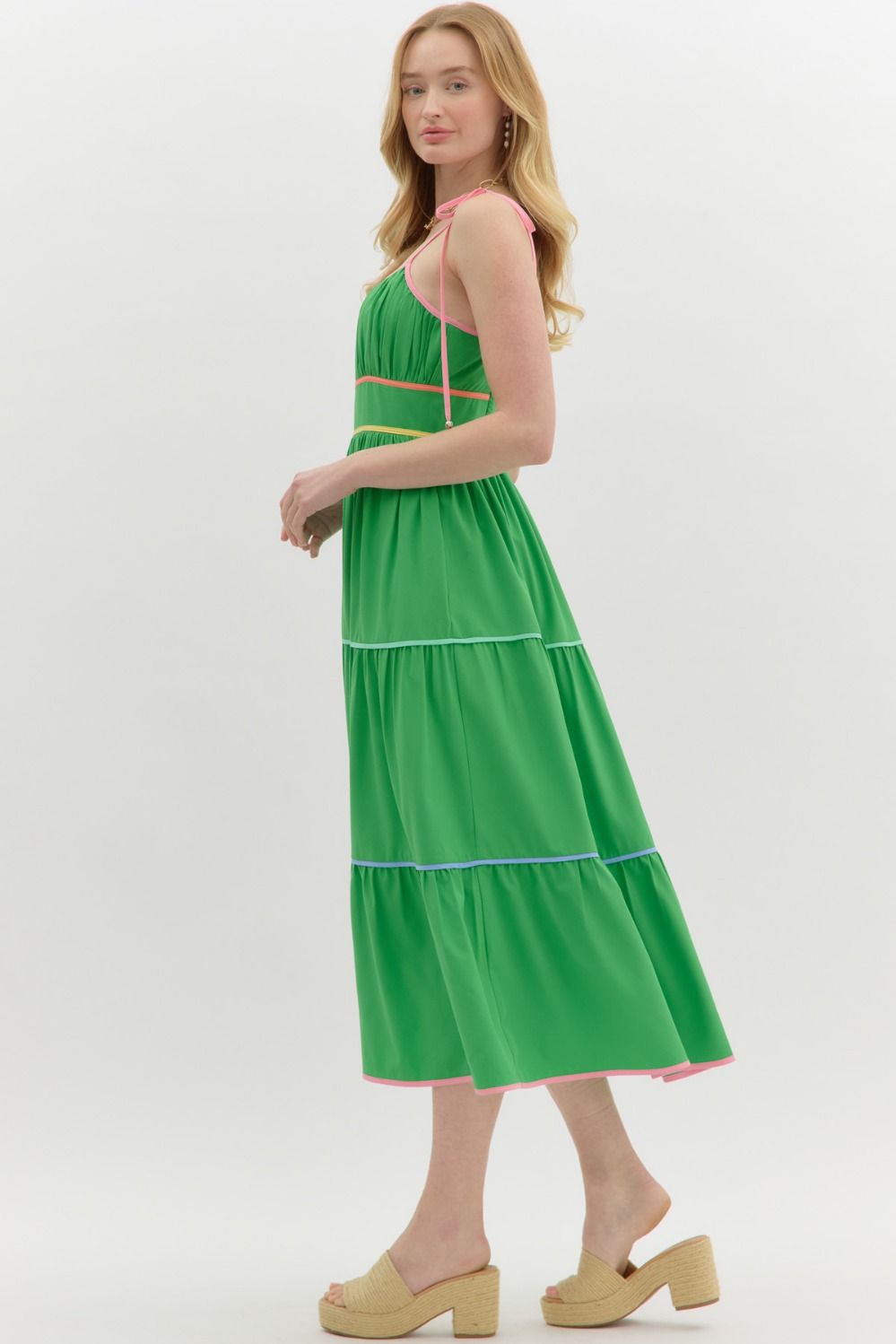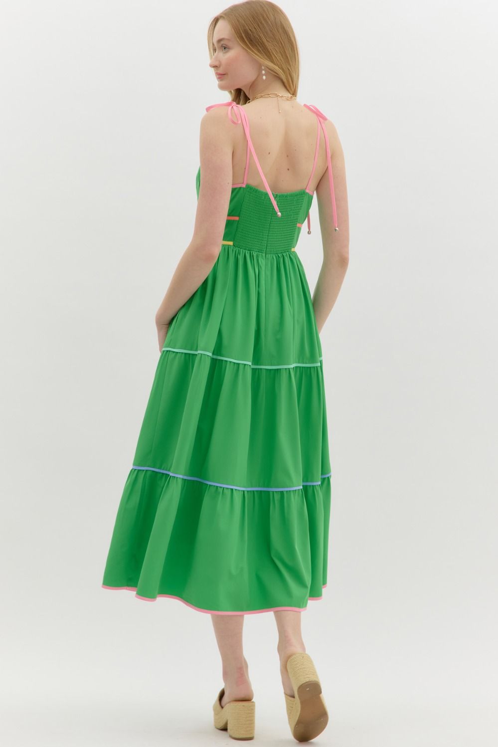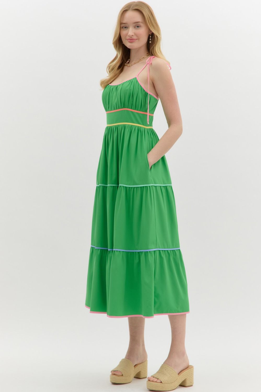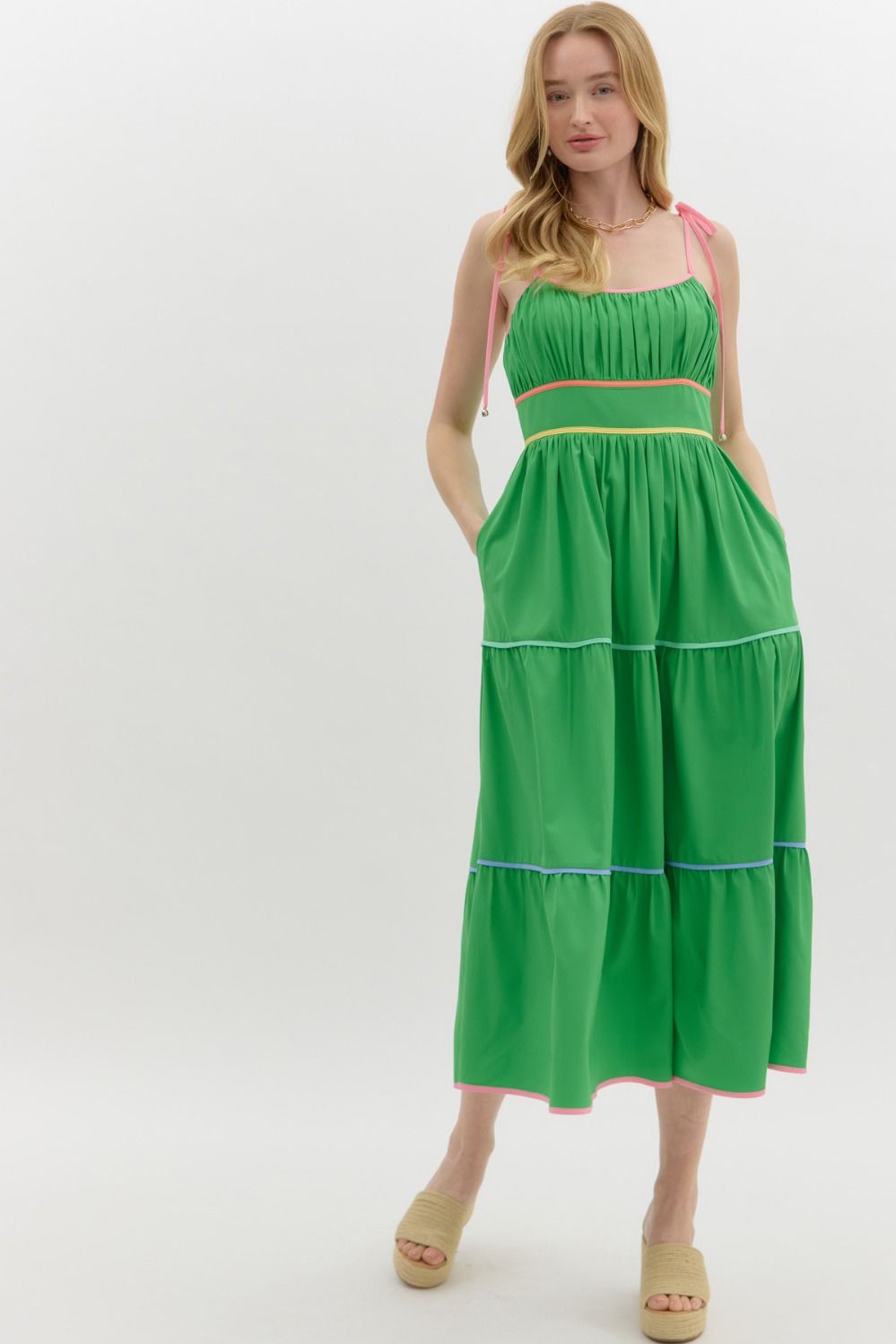 Step into summer with the Sunset Stroll Empire Midi Dress — where sweet meets sophisticated. This solid shoulder-tie dress features eye-catching multicolor contrast binding that adds the perfect pop of fun to its flattering empire silhouette. Designed with a smocked back and zipper closure for a secure, comfy fit, plus side pockets (because we all need those), this lined woven beauty is lightweight, non-sheer, and ready for anything from brunch dates to beach weddings.