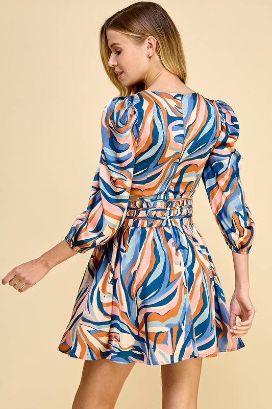 V-Neckline, fitted waist and ruffled hem. Featuring puffed long sleeves and a concealed back zipper. Model height: 5'9" Dress size: 2 Bust: 33 Waist: 25 Hips: 34