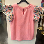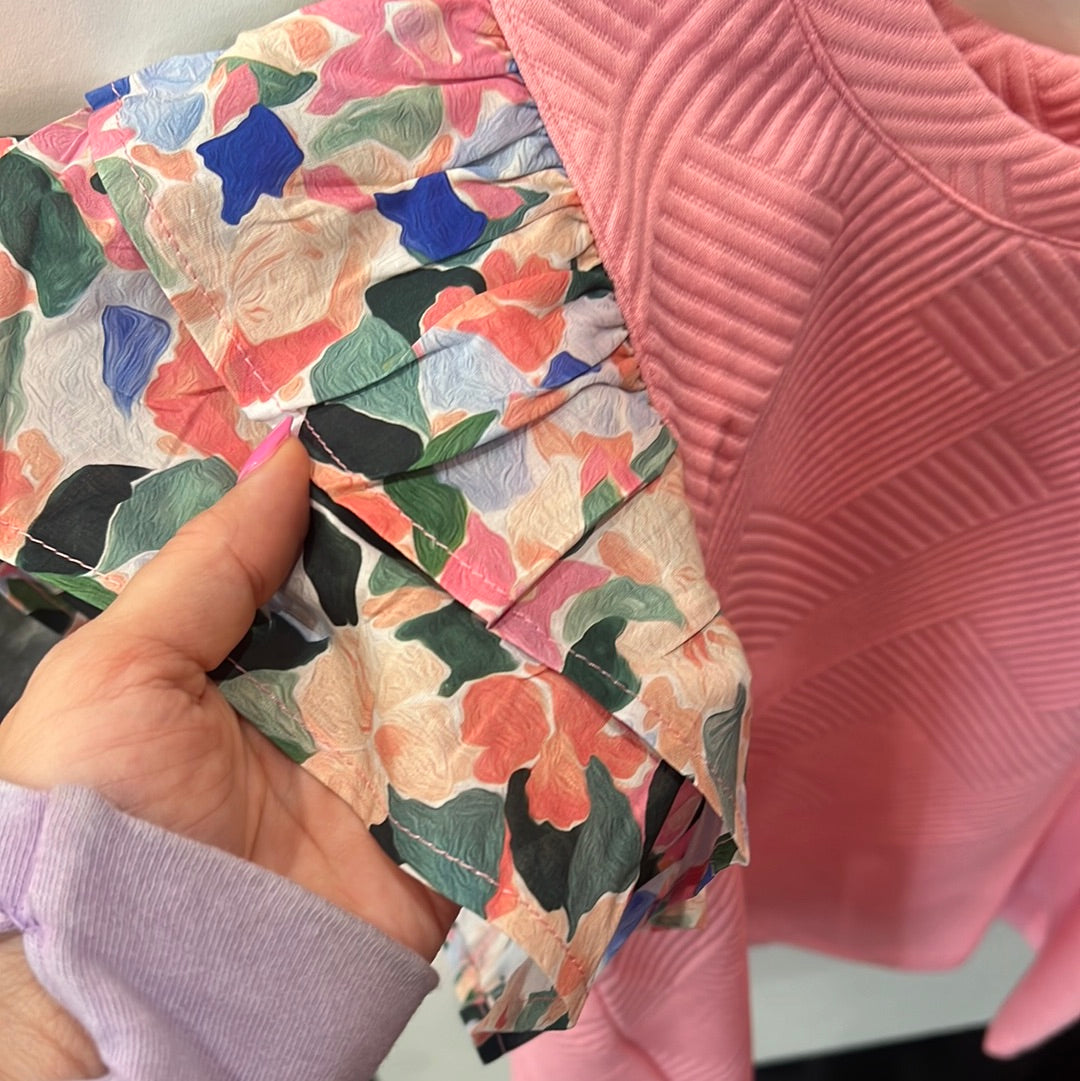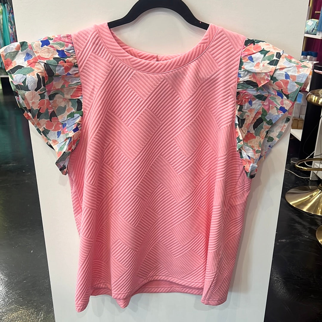 Embrace the allure of texture and charm with this captivating top. It's textured fabric adds depth and interest to the piece, while delicate floral ruffles cascade gracefully along the sleeves, giving this top a touch of grace.