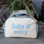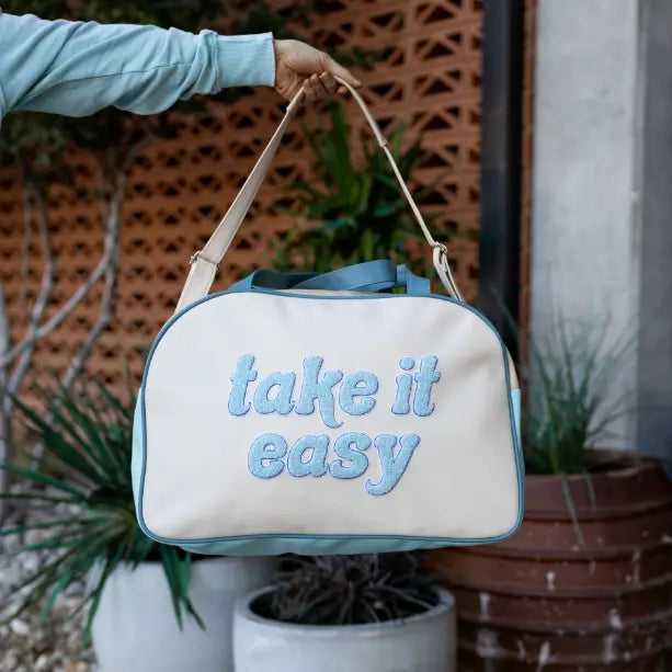This bag is all about blending style with functionality! Measuring 18 1/2" wide, 13" tall, and 9" deep, it’s spacious enough for everything you need, but not so big that it feels bulky. The exterior is made of durable PU material, and inside, the soft polyester lining keeps your stuff safe and cozy. The front features a chill "Take it Easy" chenille embroidery, giving it a relaxed, laid-back vibe. It comes with two top handles that are 9 1/2" tall, plus a crossbody strap that stretches up to 43" for comfort on the go. Inside, you'll find a 10" wide by 8 1/2" tall zippered pocket to keep smaller items organized. The trolley sleeve on the back makes it easy to slide onto your suitcase for travel. It holds up to 20-25 lbs, so it’s perfect for carrying all your daily essentials, a little extra, and everything in between!