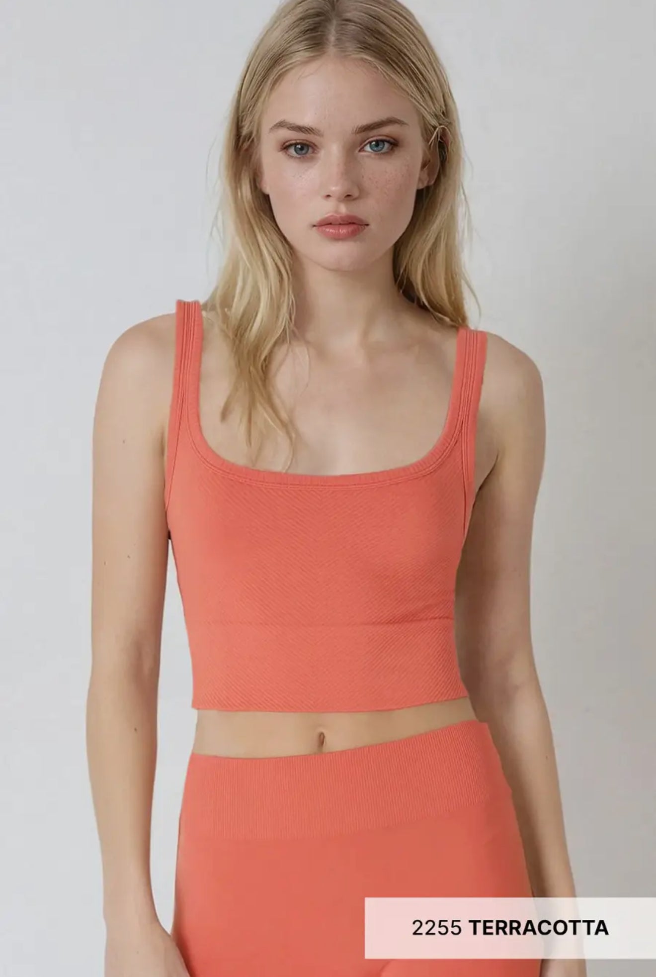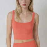 One Size fits most. Stretch A ribbed knit crop top featuring a scoop neckline. Fabric: 92% Nylon / 8% Spandex. Made in the USA