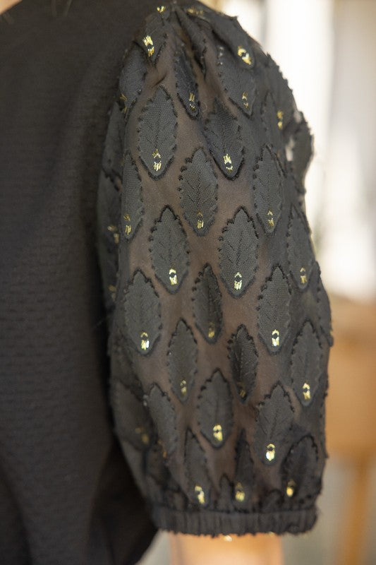 Add this stylish top to your wardrobe for a look that effortlessly combines comfort and elegance. It features a round band neckline that softly frames your face, giving it a classic touch. At the back, a delicate button and elastic loop closure add a subtle detail, making it easy to slip on and off. The short puff sleeves are adorned with a chic gold feather detail, adding a hint of sophistication and whimsy. Made from a woven fabric, this top drapes beautifully, making it perfect for both casual outings and dressier occasions. It’s a versatile piece that feels just as good as it looks!