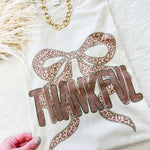 One of the cutest tees of the season, screen printed on Gilden dry blend this T-shirt fits true to size. It has the word thankful, with the cutest bow filled in leopard print.