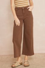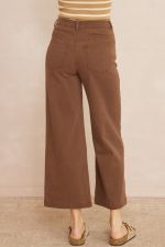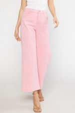 Acid wash high waisted wide leg pants featuring zipper front closure. Pockets at side and pack. Unlined. Woven. Non-sheer. Lightweight.