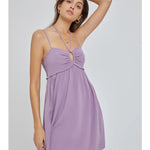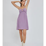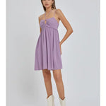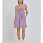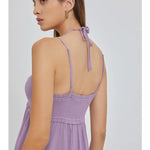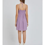 Elegant double-waisted mini dress, features a tied halter neckline, creating a cutout at center. The elastic double waist has ruffled ends. Smocked back and pockets. Double-lined for safety.