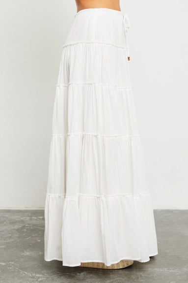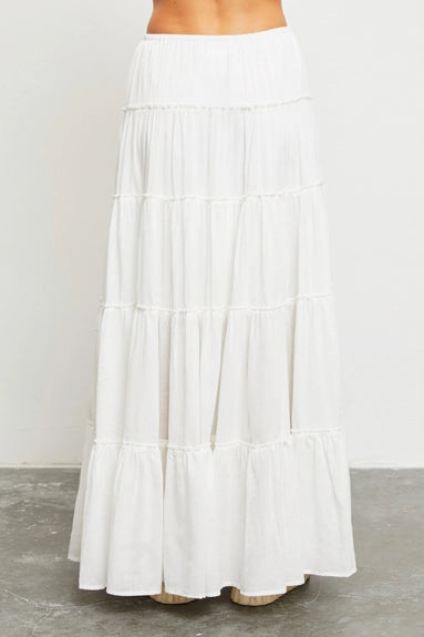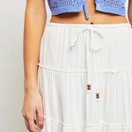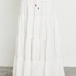 Introducing our tiered maxi skirt with a drawstring, a bohemian-inspired masterpiece that exudes effortless style and comfort. Crafted with care and attention to detail, this skirt features multiple tiers of flowing fabric that cascade gracefully to the ankle, creating a dynamic and romantic silhouette that moves with you as you walk. The drawstring waist adds a touch of versatility and adjustability, allowing you to customize the fit to your preference and ensuring all-day comfort. Whether cinched at the waist for a defined silhouette or left loose for a relaxed vibe, the drawstring detail adds a hint of boho charm to the piece.
