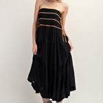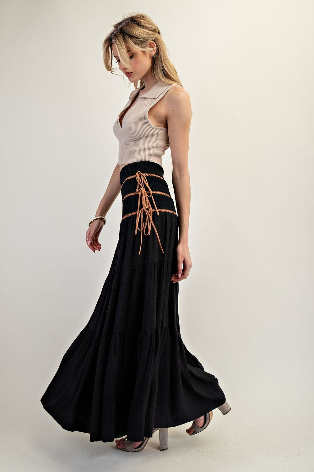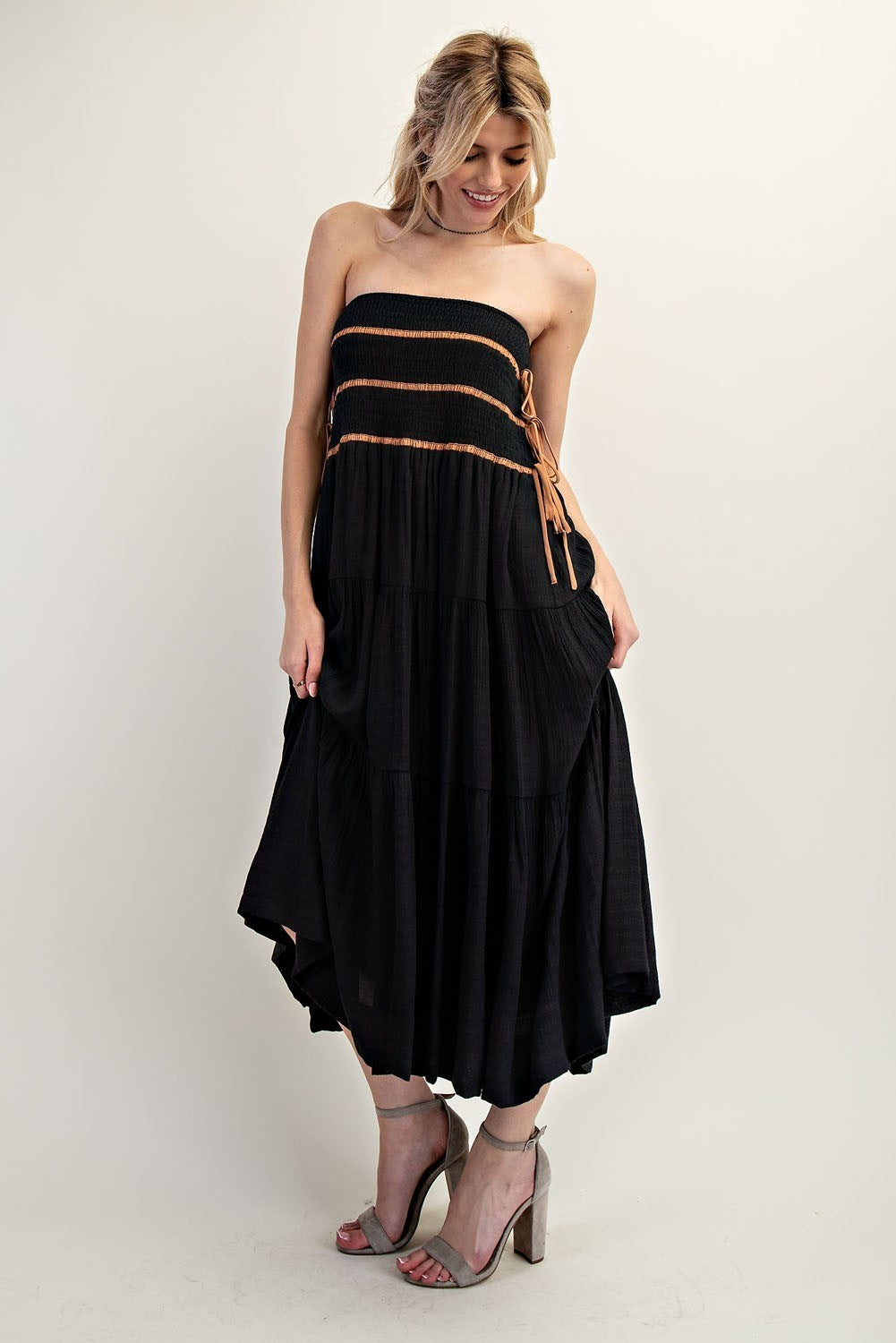 This versatile smocked piece doubles as both a skirt and a dress, featuring a stretchy, ruched bodice with delicate lace up side ties, a tiered flowing silhouette, and lightweight textured fabric, creating an effortlessly bohemian and customizable look that adapts to any occasion.