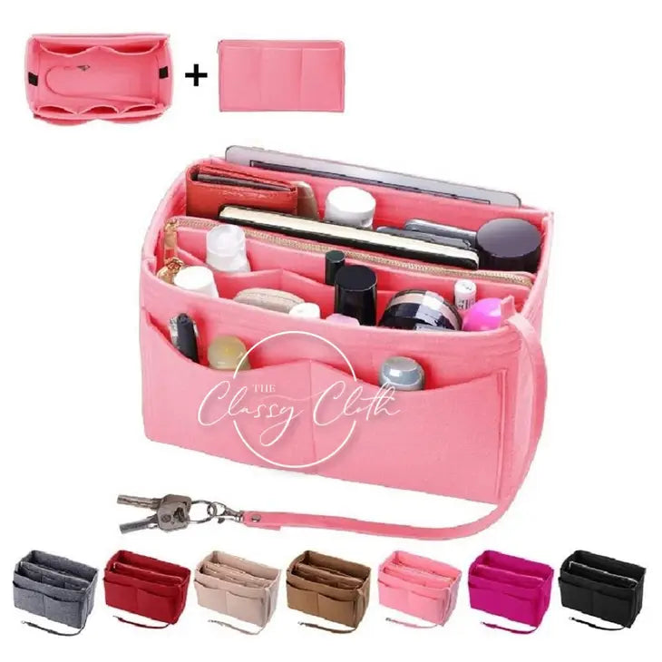 No more loose items in your big purse. Organize everything from makeup necessities to notebooks & pens & eliminate digging through loose items to find what you are looking for. This insert fits perfectly in the Neoprene Bag. Retrieve items quickly Change out your bag in seconds Keep your handbag shape nice & full Prevent the inside of your bag from damage from sharp objects like pens & keys Fabric: 3mm Felt Dimensions: 13.4 inches wide 6.7 inches high 7.0 inches front to back width
