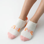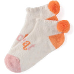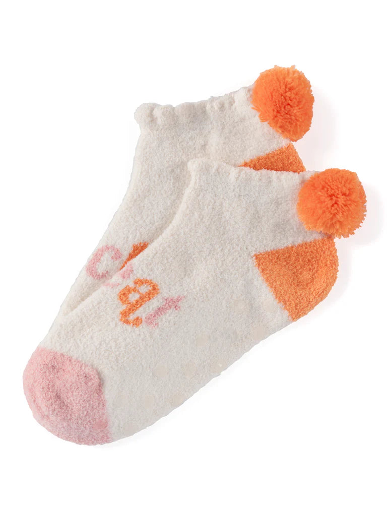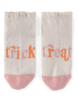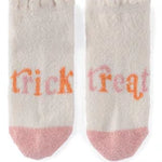 Show off your spookiest style with these “Trick/Treat!” Home Socks. These adorable, ankle-height socks feature a white background with the words “Trick” and “Treat” across either foot in pink and orange letters. Featuring a practical rubber grip bottom and a chic orange pom-pom detail at the ankles, they are the perfect pair of spirited socks to wear while greeting trick or treaters. Pair with other items from the Spooky Season collection to complete your Halloween look!