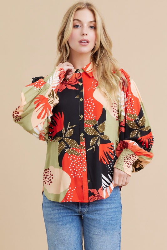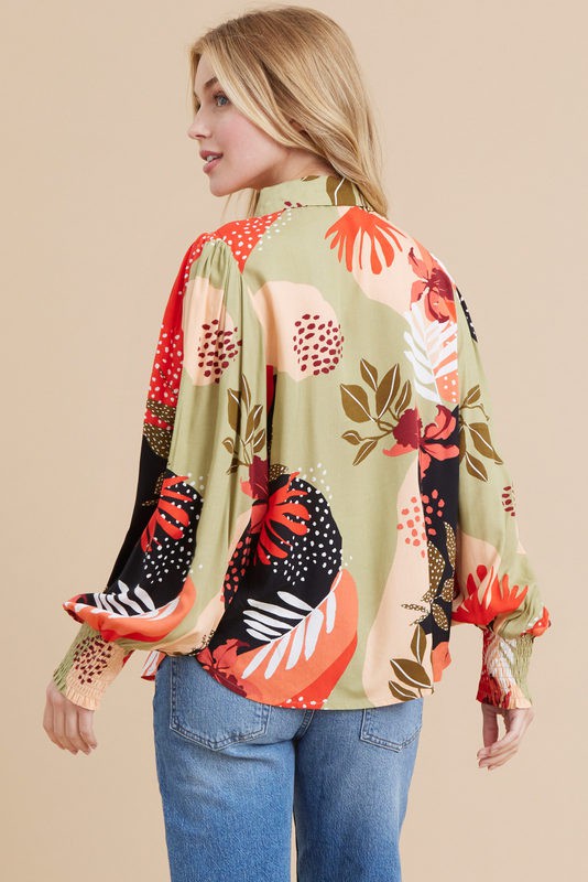 Satin print top with collared neck, long peasant sleeves and smocked cuffs. - Button-front, non-sheer, lightweight. - Model is 5'8'' and is wearing a Small. 100% Rayon