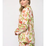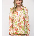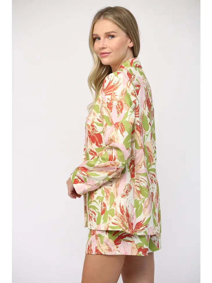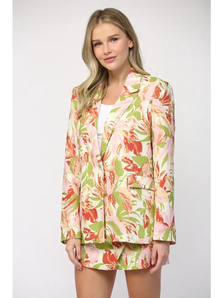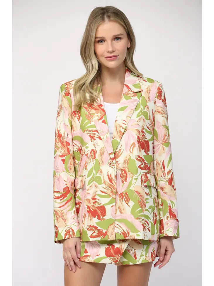This vibrant tropical blazer embraces the essence of paradise with lush greens, crimson reds, and soft pinks intricately woven into the design. Pairs perfectly with our matching skort, this ensemble radiates a playful and chic tropical vibe, ideal for making a bold fashion statement with a touch of island allure.