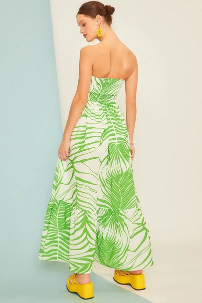 This tropical maxi dress was designed for both comfort and style. This chic ensemble features a thigh-high slit on one side for a touch of allure, while keyhole details near the bust adds a hint of sophistication.