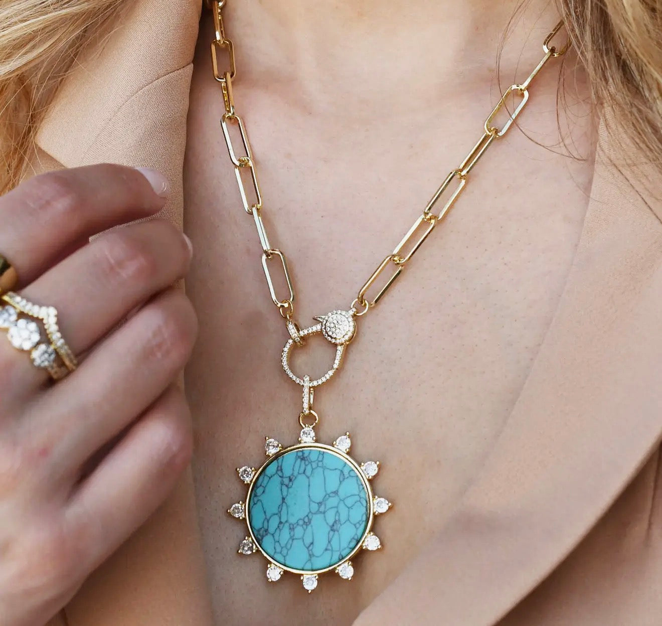 Radiate bold beauty! Featuring a striking turquoise pendant framed in a golden sunburst design and accented with crystal details, this piece captures both elegance and energy.