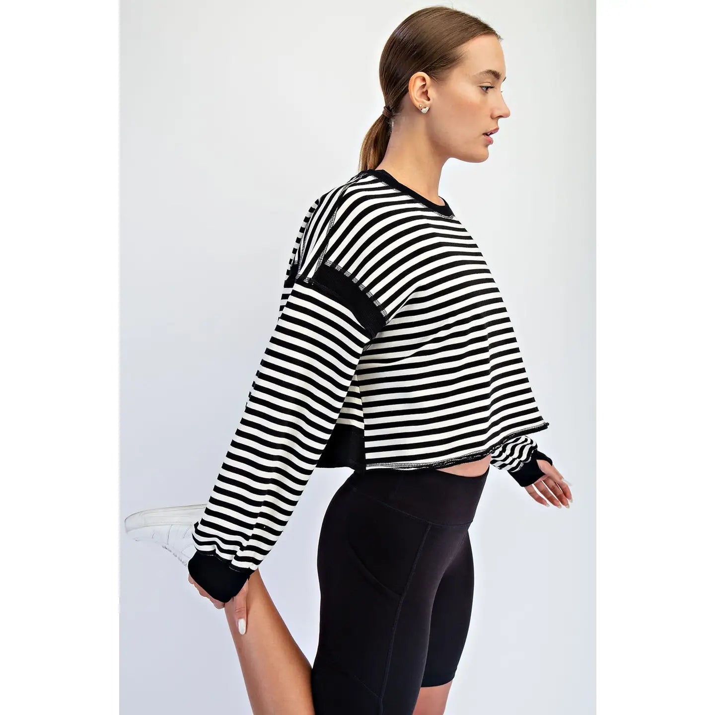 Unexpected and unapologetic. This striped top turns heads with its striking open back, exposed seams, and bold attitude. Designed to stand out, it's a statement piece that does all the talking-no effort required. Features: - Stripe yarn dyed French terry fabric - Relaxed fit / Oversized - Cropped length - Long sleeve top - Dropped shoulders - Wide round neckline - Open back - Pronounced seam details - Thumb holes details Model is 5'9" and wearing size Small. Fabric: 54% Polyester, 40% Cotton, 6% Rayon / 95% Cotton, 5% Spandex