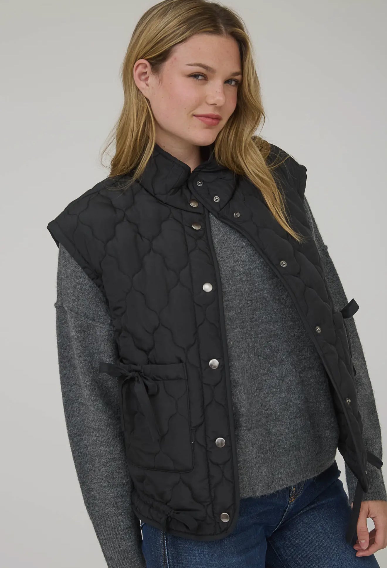 Stay warm in style with our Quilted Cozy Chic Vest — the perfect layering piece for chilly days. Designed with a soft quilted texture and flattering side ties, this vest adds both comfort and shape to your outfit. Featuring snap-button closures and roomy front pockets, it’s functional, fashionable, and effortlessly versatile.