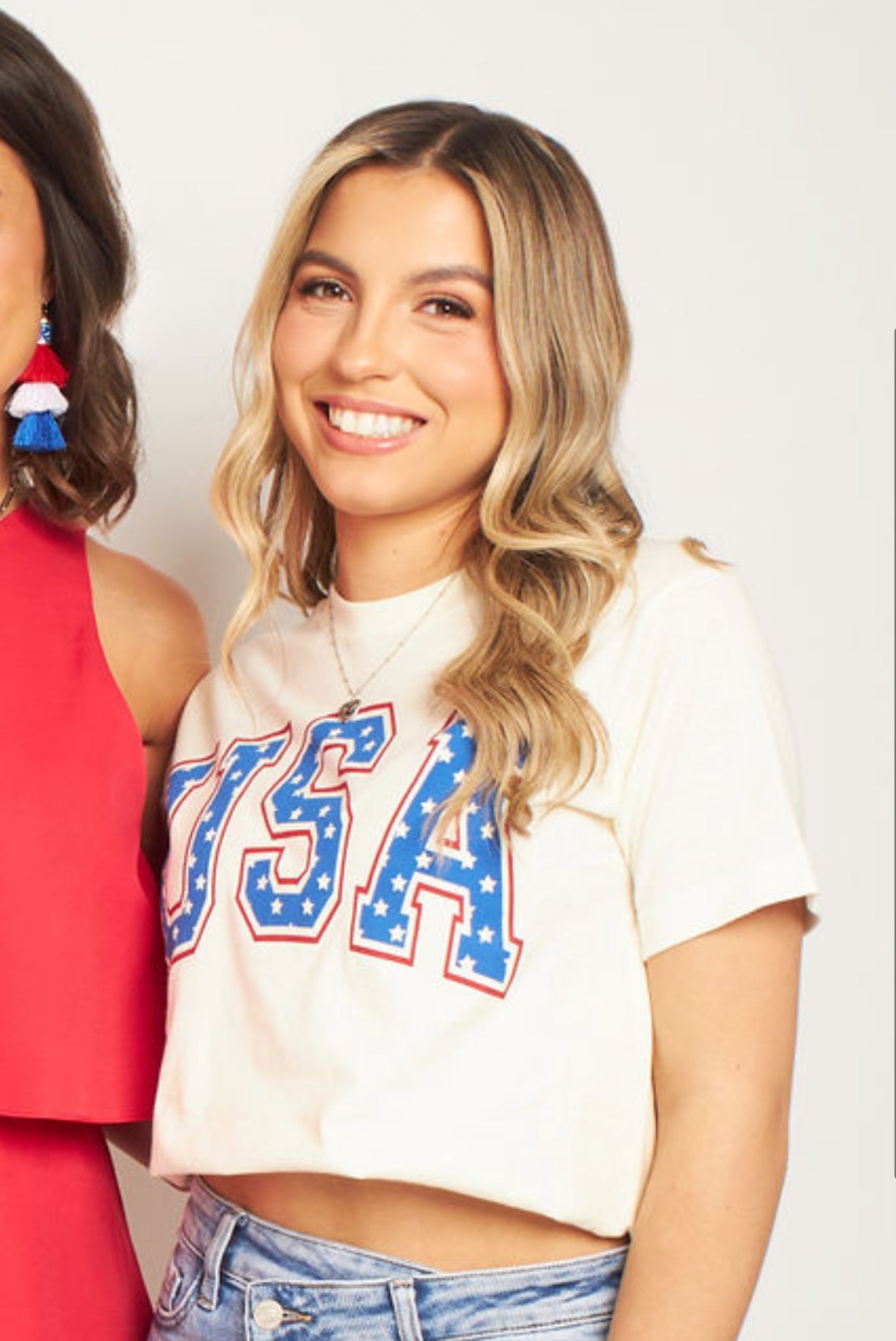 Introducing a patriotic addition to your wardrobe, this cream-colored tee featuring " USA" printed in bold lettering. The inside of each letter features a vibrant hue, reminiscent of the American flag, with the cream shining through the cut-out stars for added flare! Each letter is bordered in striking red, completing the patriotic design!