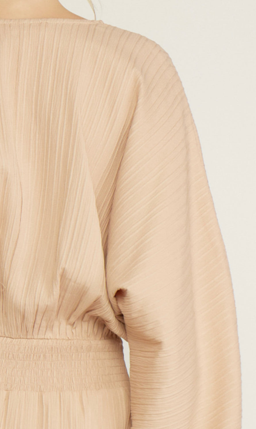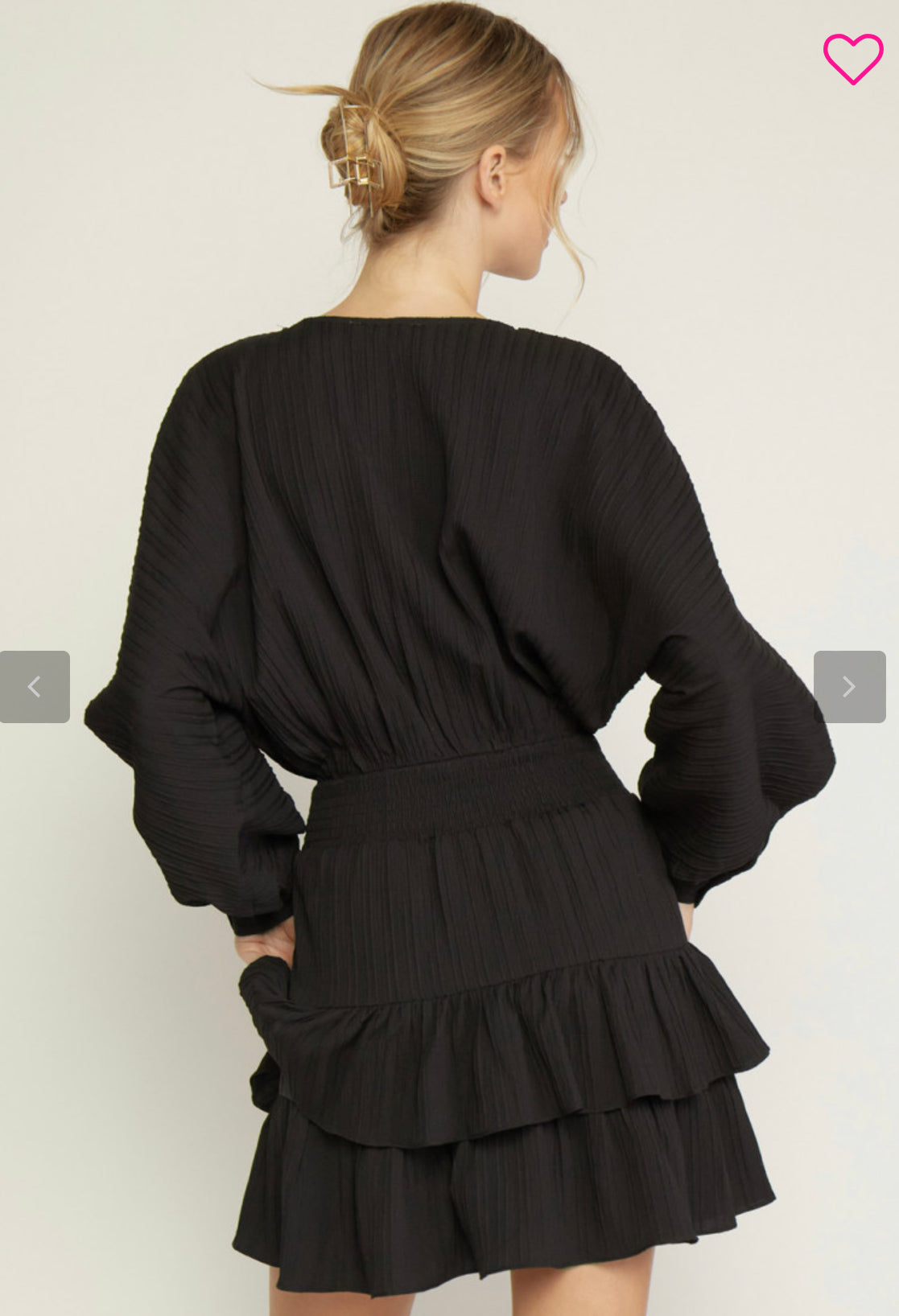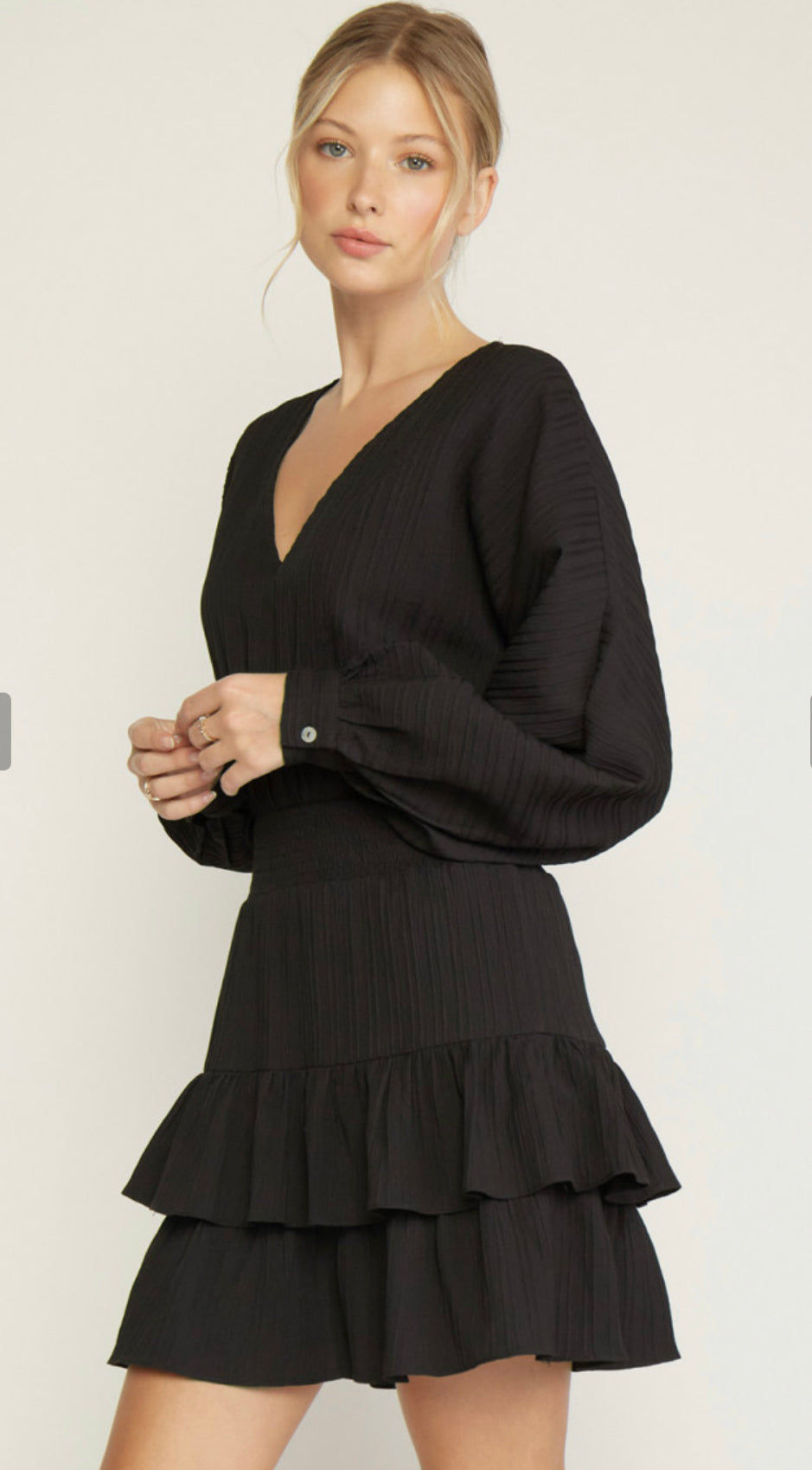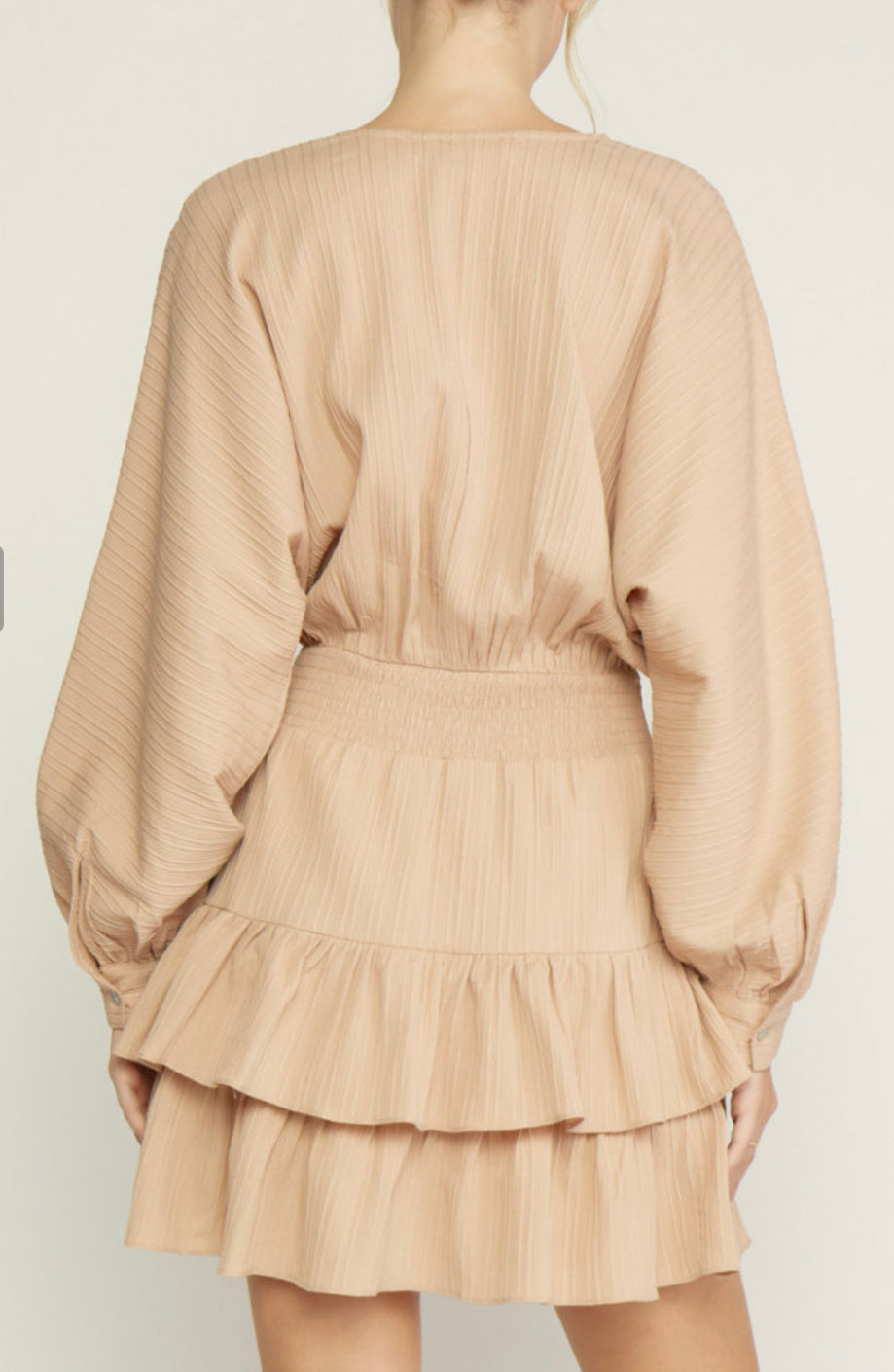Textured v-neck long sleeve tiered mini dress featuring smocking at waist. Button closure at sleeves. Lined. Woven. Non-sheer. Lightweight.