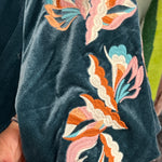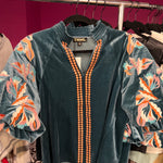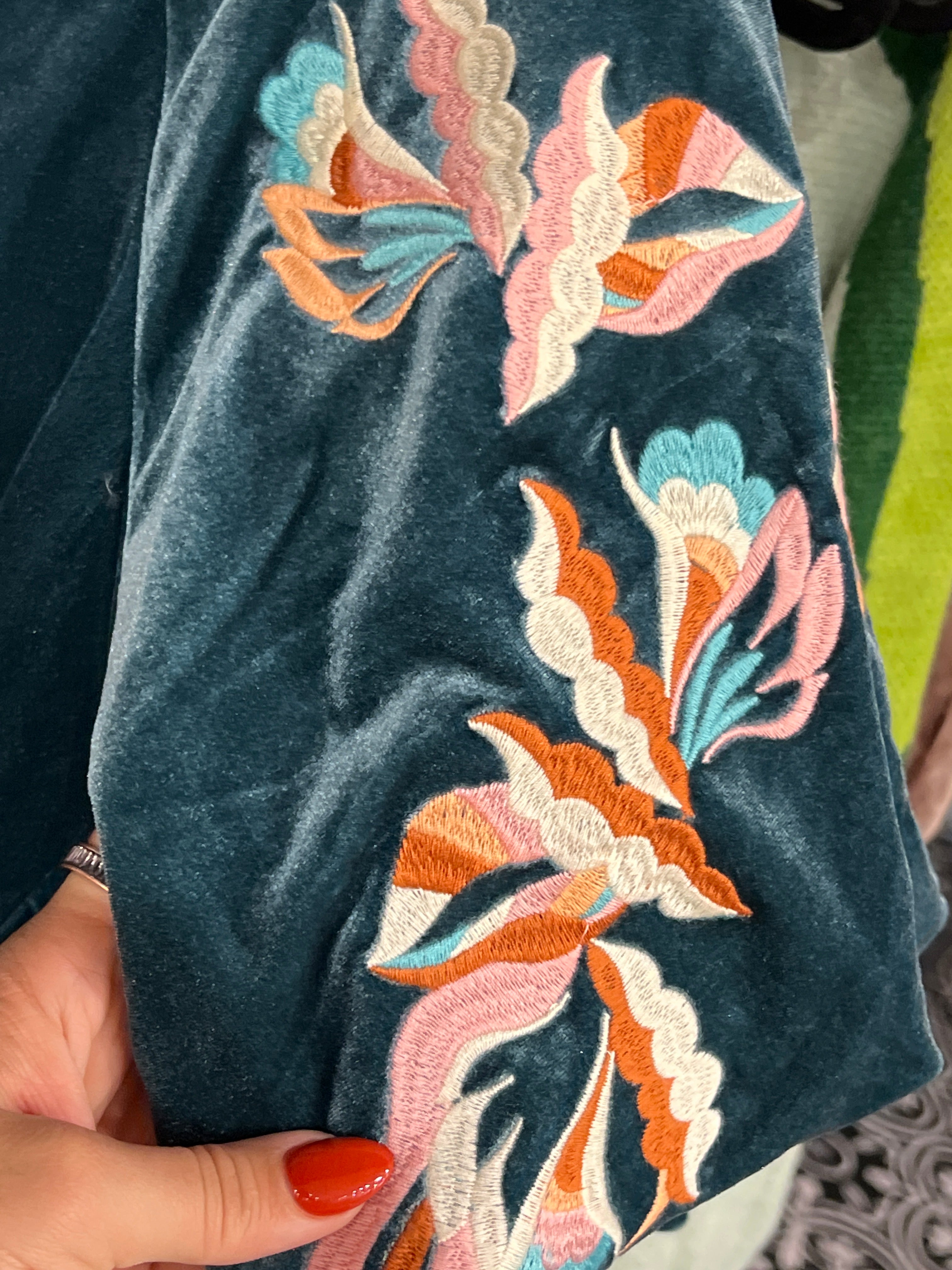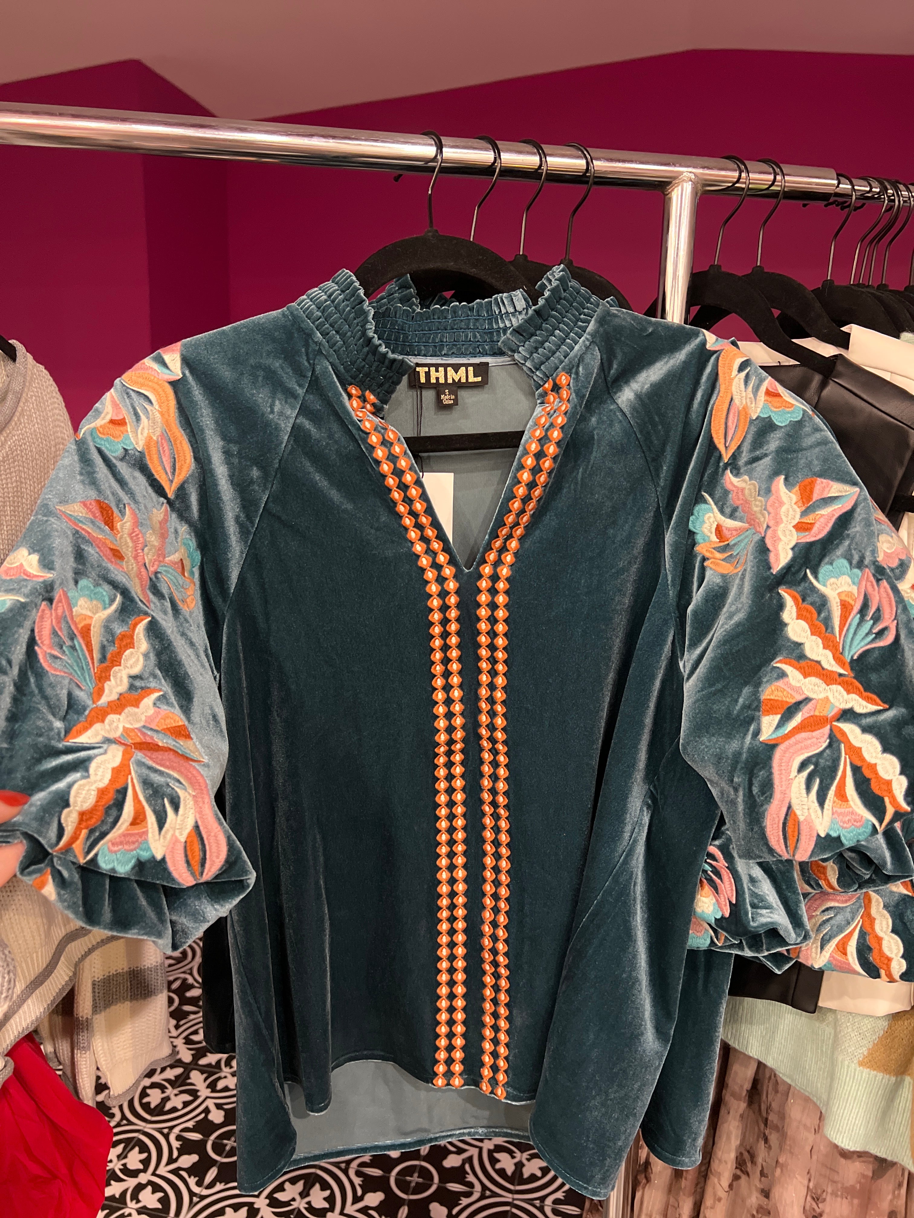 Imagine a rich blue velvet top that feels as luxurious as it looks, with soft fabric that instantly adds elegance to your outfit. The puff sleeves create a bold, fashion-forward silhouette, giving it that perfect blend of drama and charm. What really sets this top apart is the intricate embroidery—delicate details stitched across the velvet, adding an artistic, handcrafted feel. It’s the kind of top that makes a statement all on its own, perfect for those days when you want to look effortlessly chic with a touch of elegance and flair.