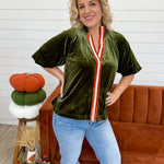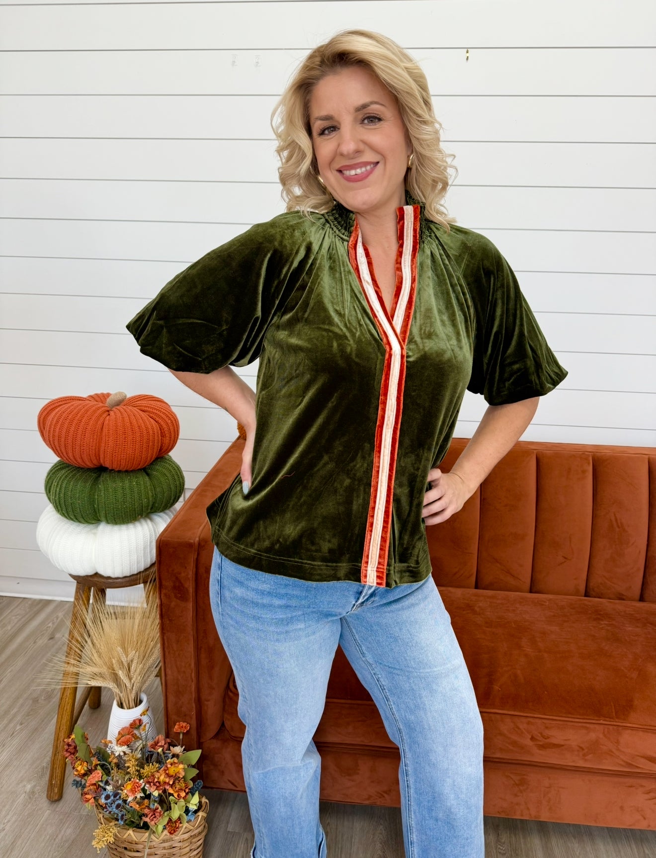 Elevate your wardrobe with our Velvet Luxe Trim Blouse, a statement piece that embodies elegance and sophistication. Crafted from plush, deep olive velvet, this blouse features striking contrast velvet trim in rose and rust tones for a touch of refined drama. The smocked neckline and flowy fit create a silhouette that’s effortlessly chic — perfect for holiday gatherings, dinners, or a night out.