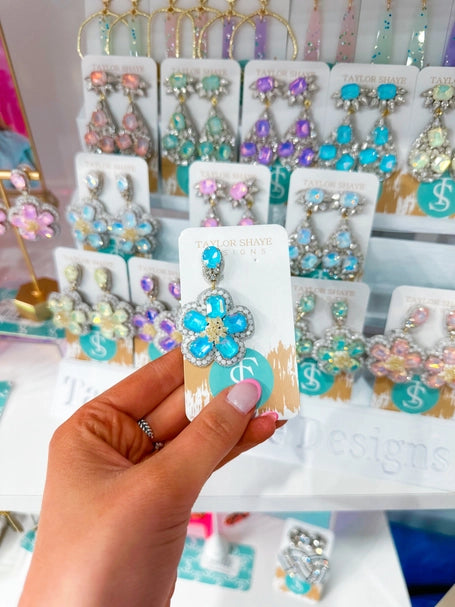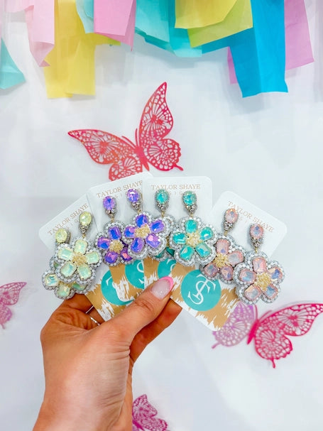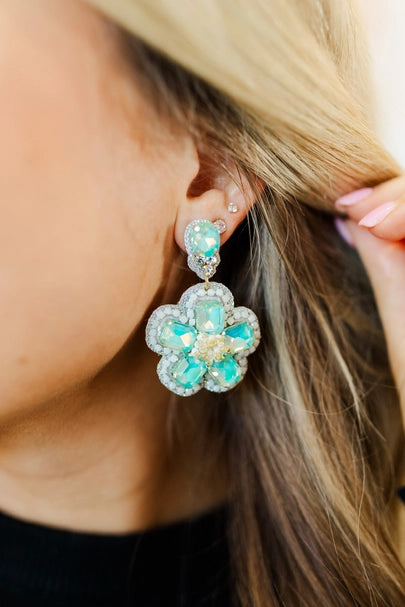 Add some springtime flair to your outfit this upcoming spring season with these exquisite, beaded flower earrings showcasing delicate pastel blue gemstones.