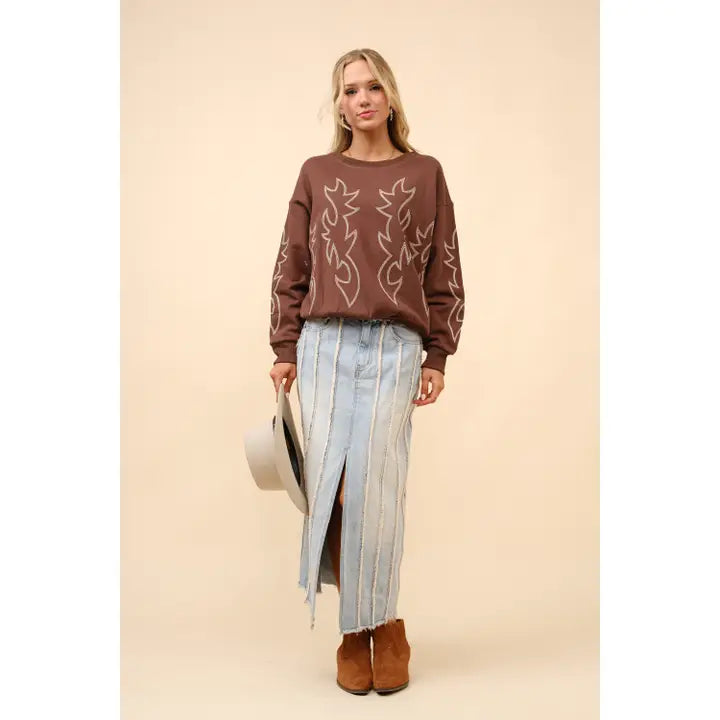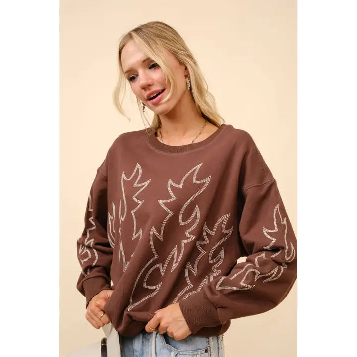 Add a touch of Western charm to your casual look with this cozy pullover sweatshirt. Featuring a unique Western boots stitch design, it’s the perfect mix of comfort and style. The soft fabric keeps you warm and relaxed, while the cool boot detailing adds a fun, rustic twist to your everyday outfit. Whether you're lounging at home or out running errands, this sweatshirt gives you a laid-back, stylish vibe that’s sure to turn heads. It's the ultimate blend of cozy and chic with just the right amount of cowboy flair!
