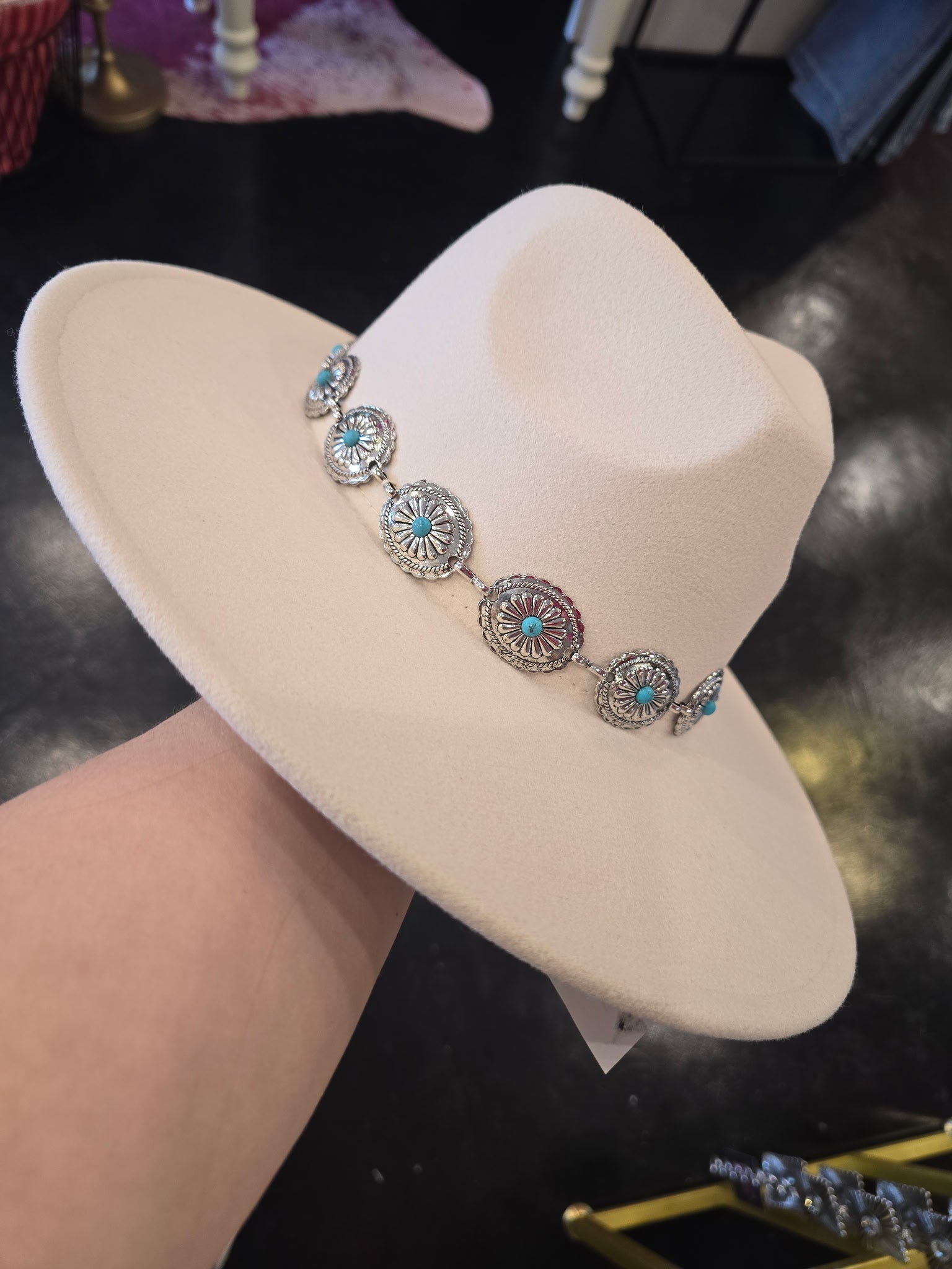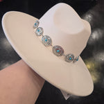 A western theme felt hat in cream, it also has the cutest silver concho band with hints of Turquoise. Adjustable.