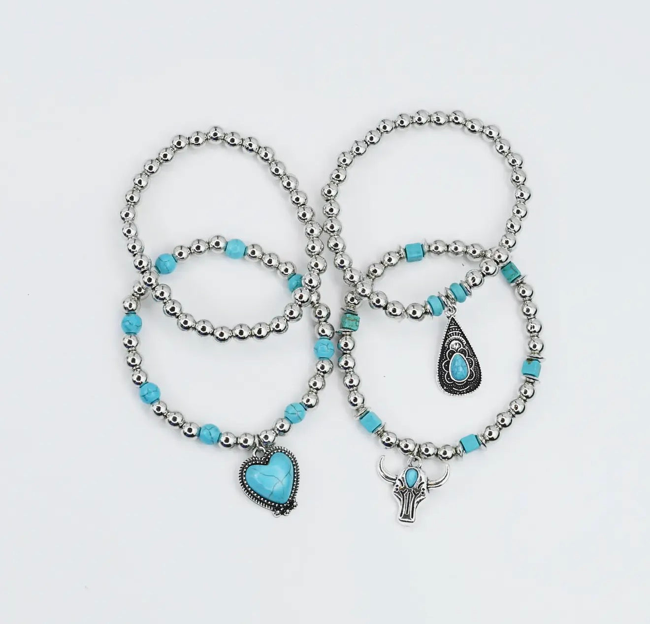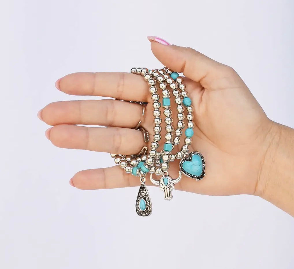 • Channel your inner free spirit with these stunning mix of silver beads, turquoise stones, and western inspired charms.