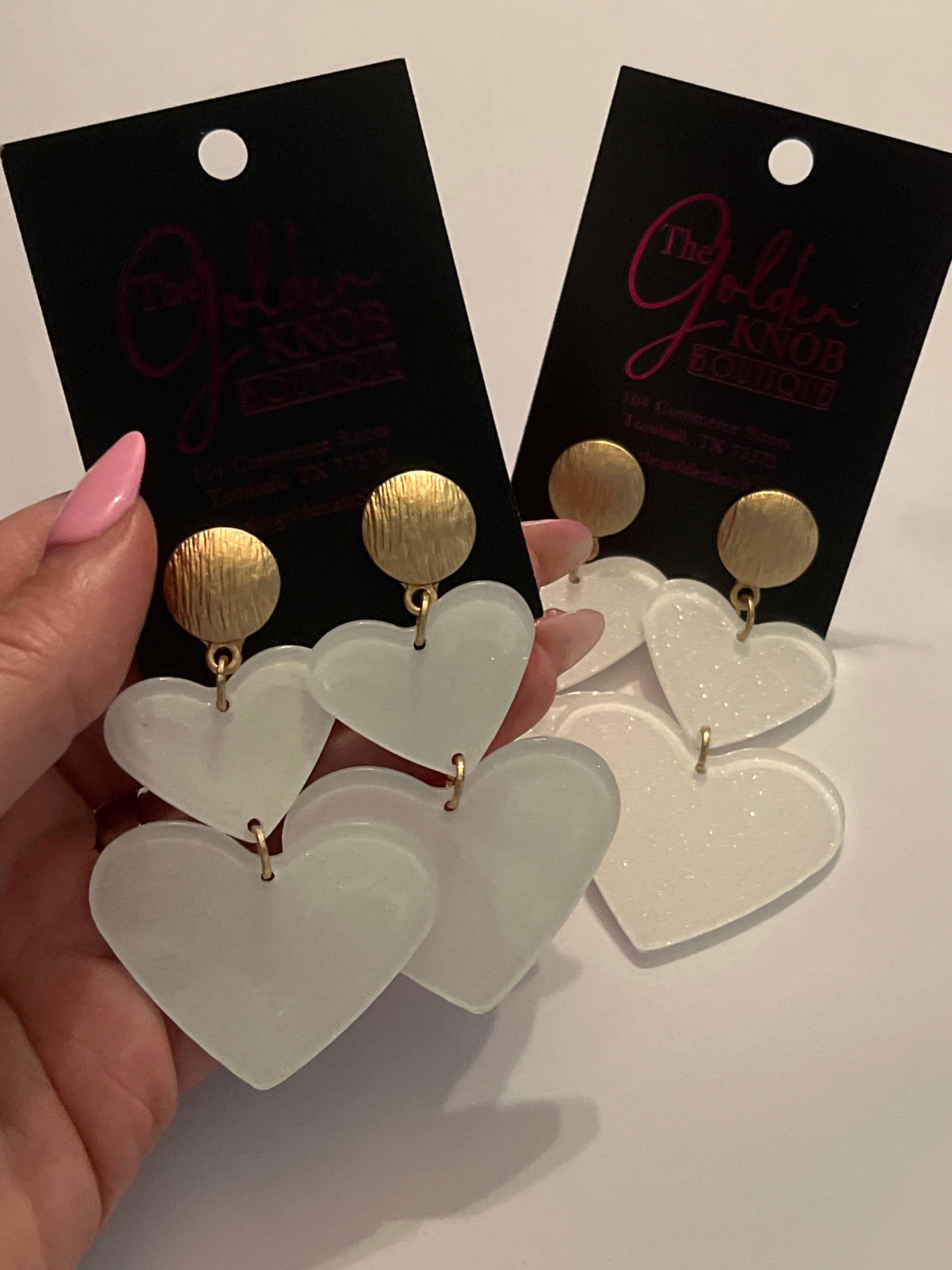 Sweet, sparkly, and full of charm — our White Glitter Double Heart Earrings are the perfect blend of playful and chic. Featuring two glittery white hearts, the design starts with a smaller heart on top and finishes with a larger heart below, catching the light with every move.