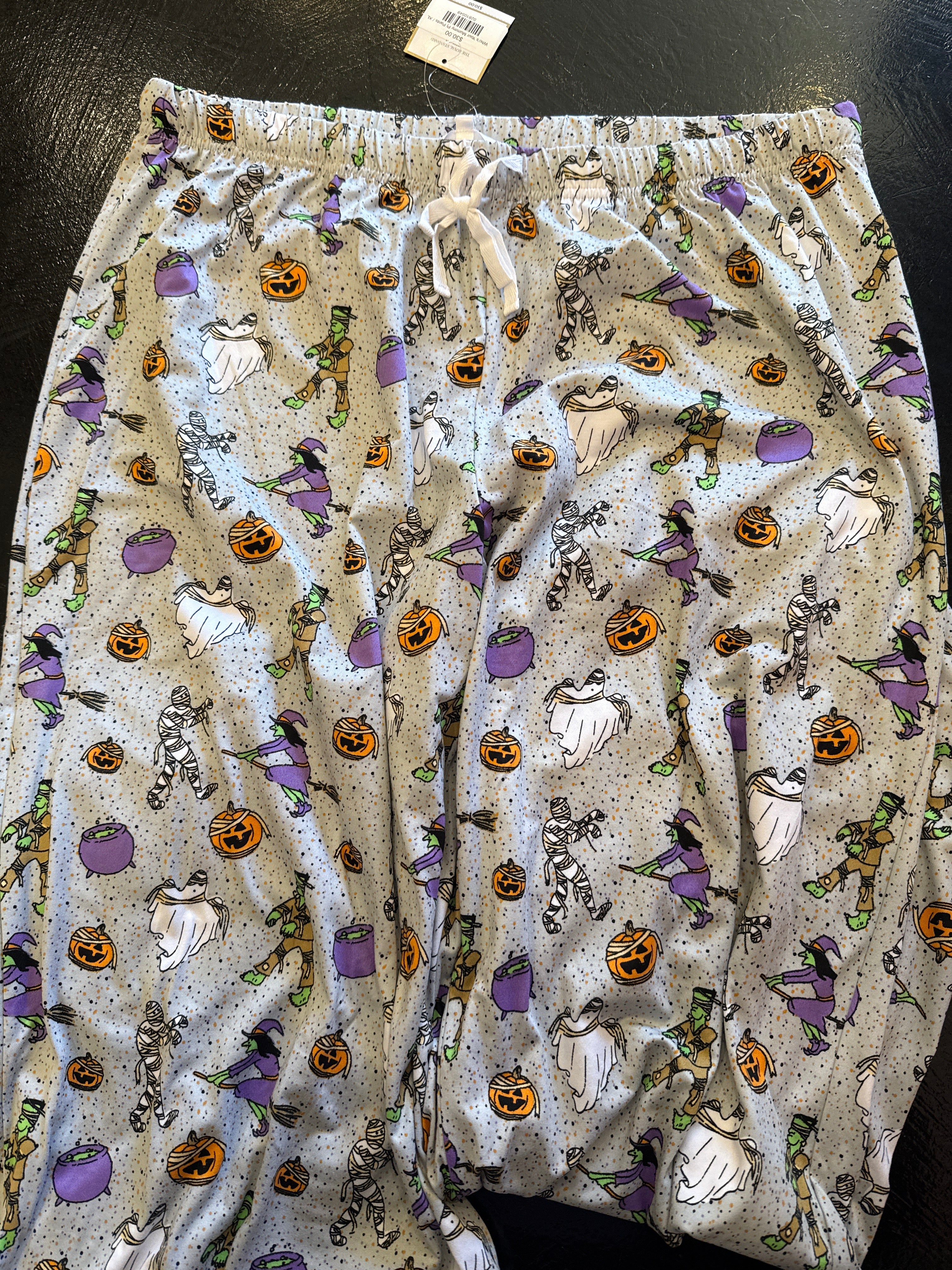 Picture slipping into the coziest pair of Halloween-themed pajama pants that are all about getting into the spooky spirit. These PJ pants feature a fun and festive design with Frankenstein, flying witches, mummys and pumpkins scattered across a dark backdrop. The vibrant, whimsical print brings a playful touch to your nighttime routine, making them perfect for lounging around during the Halloween season. The soft, stretchy fabric ensures comfort for all your ghostly activities, whether you’re watching scary movies, handing out candy, or just enjoying a chill evening. With their festive pattern and comfy fit, these pajama pants make it easy to celebrate Halloween in cozy style.