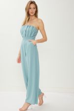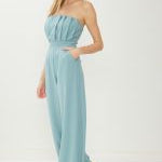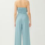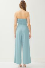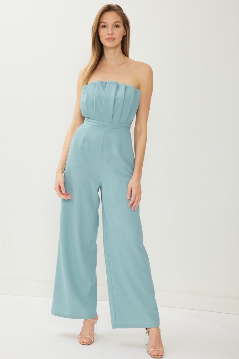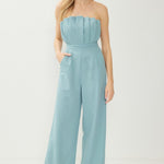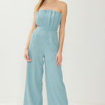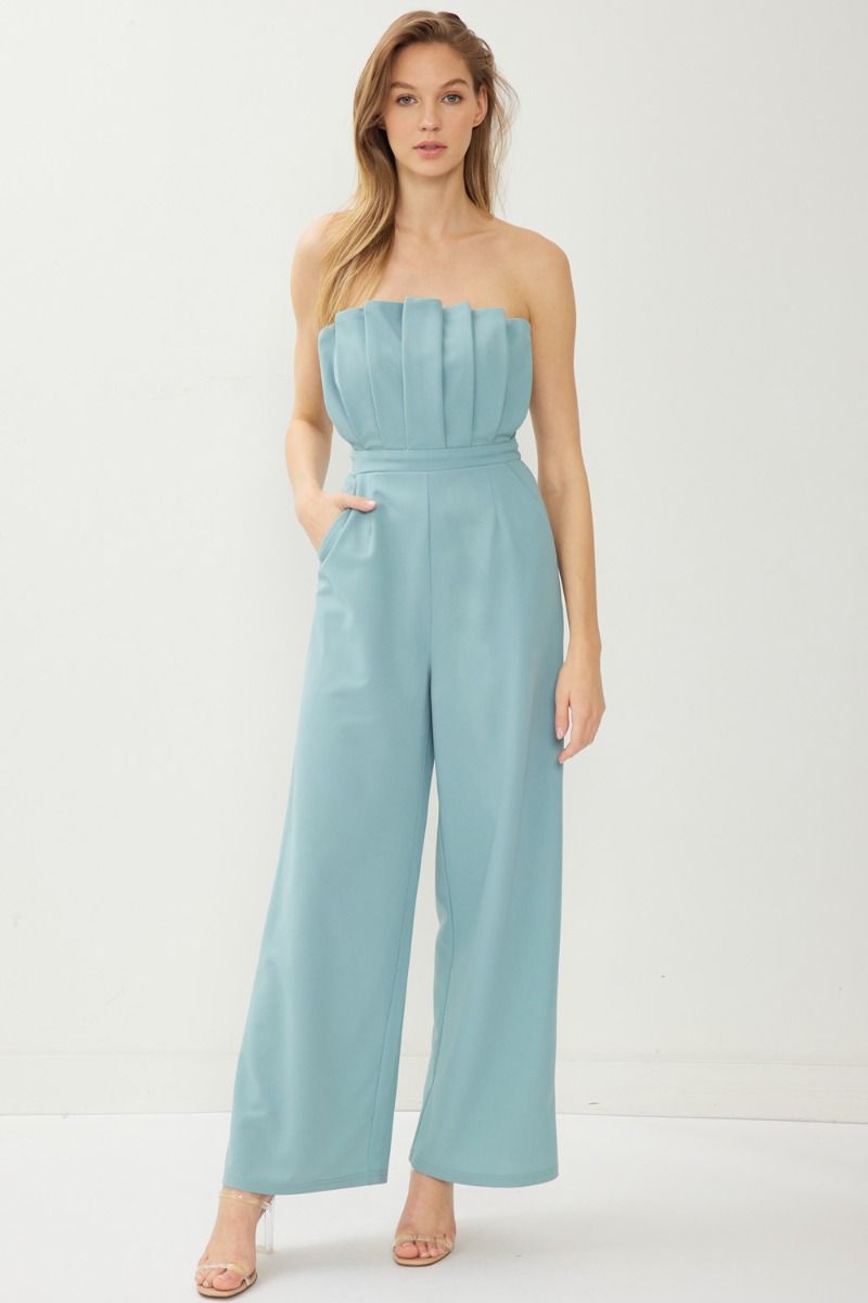 Solid wide leg tube jumpsuit featuring pleated bust and ruched back. Pockets at side. Zipper on back. Lined. Woven. Non-sheer. Lightweight.