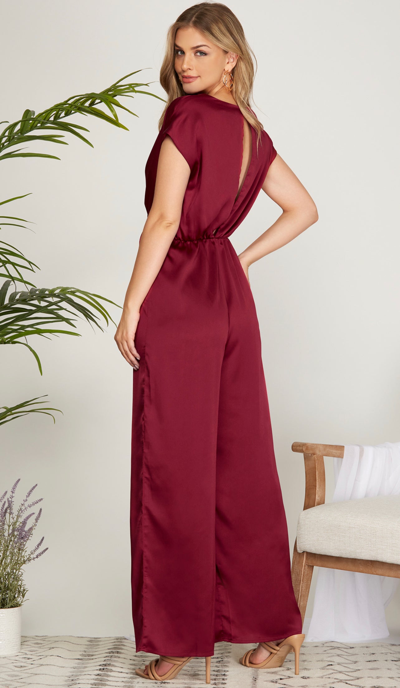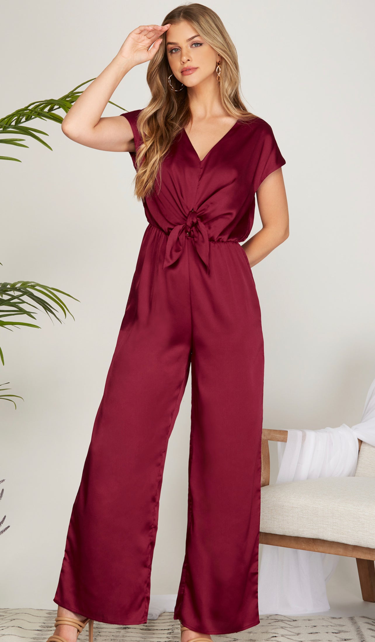 Wine Short Sleeve Satin Jumpsuit With Front Tie Detail