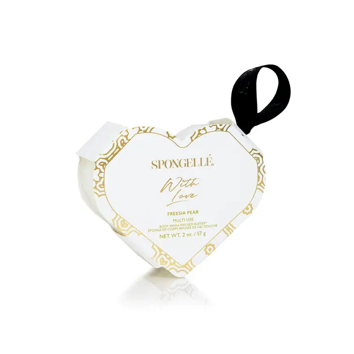 Send a love letter with Spongelle’s With Love Heart Buffer in Freesia Pear. Perfect for travel, these heart-shaped body wash infused buffers will cleanse, exfoliate, massage and love your skin.