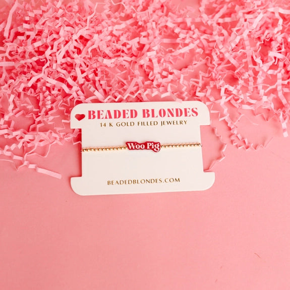 Calling the Hogs is a tradition of University of Arkansas so get ready to support your favorite team in style with the Woo Pig Bracelet! Perfect for game day, this bracelet features gold beads and the saying " Woo Pig" in acrylic lettering that will be sure to catch everyone's eye. Show off your team spirit and accessorize like a true fan! Our signature 14 K gold filled beaded bracelets with custom made beads.