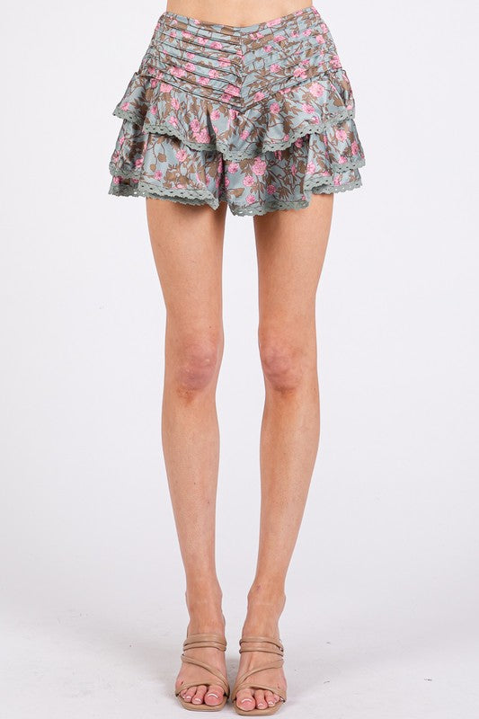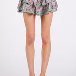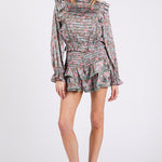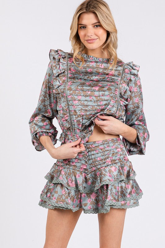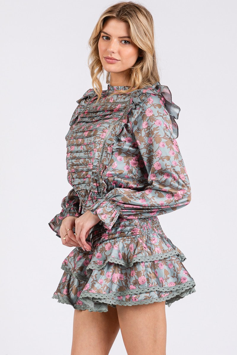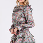 This floral print long-sleeve top and skort set is the perfect blend of feminine charm and comfort. The top features a high neckline with beautiful layered ruffles that give it a soft, romantic feel. A single button closure at the back adds a touch of elegance. Paired with the skort, which has a fun, tiered design that adds a flouncy movement with every step, this outfit offers both style and ease. The smocked back of the skort ensures a comfortable, flexible fit, making it as practical as it is pretty. Whether you're dressing up for a casual outing or a special event, this set combines sweet details and a flattering fit for a truly lovely look.