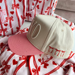 * XOXO! Perfect hat for Valentine's Day! * + 3 red bows embroidered on the side! * Pink vintage trucker hat with neutral embroidery, with adjustable snapback