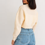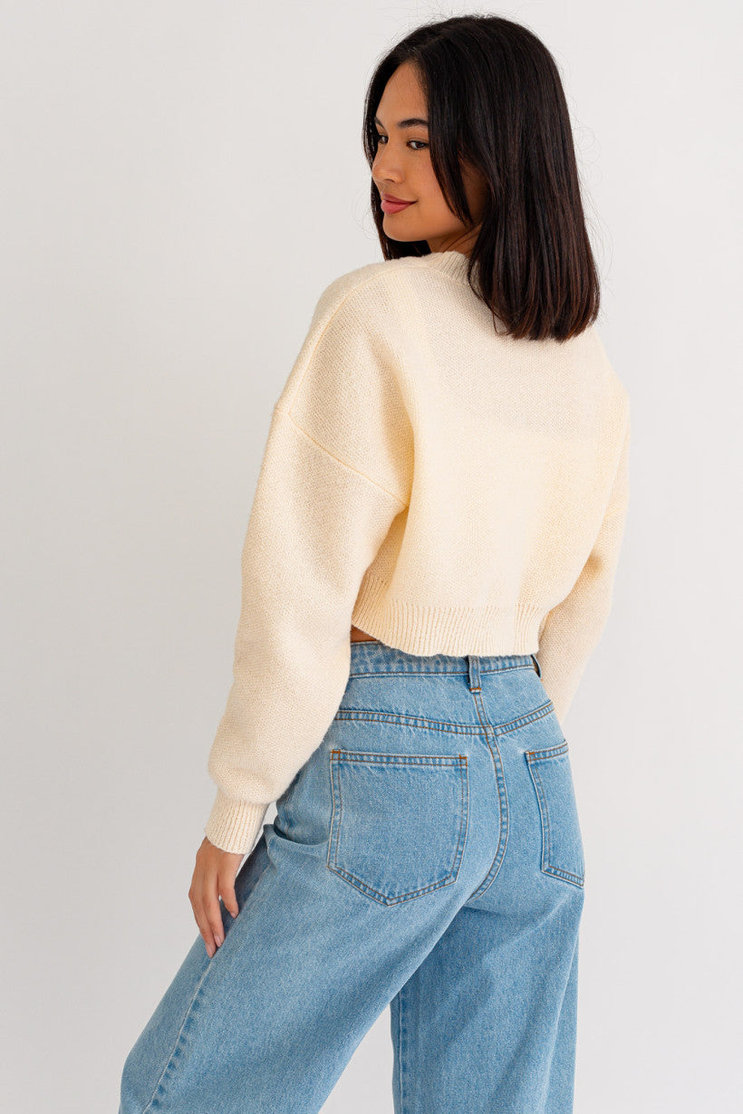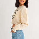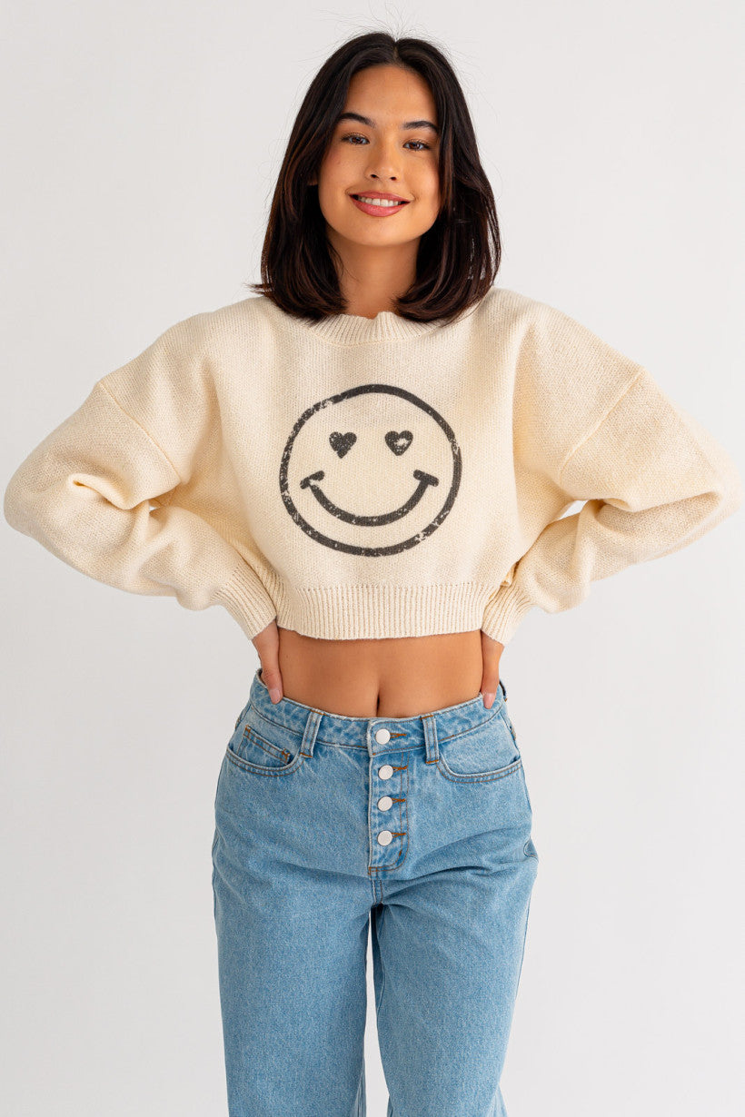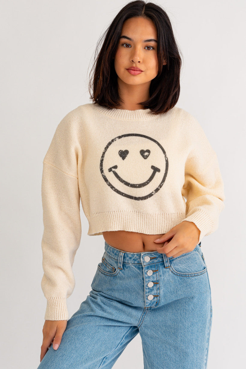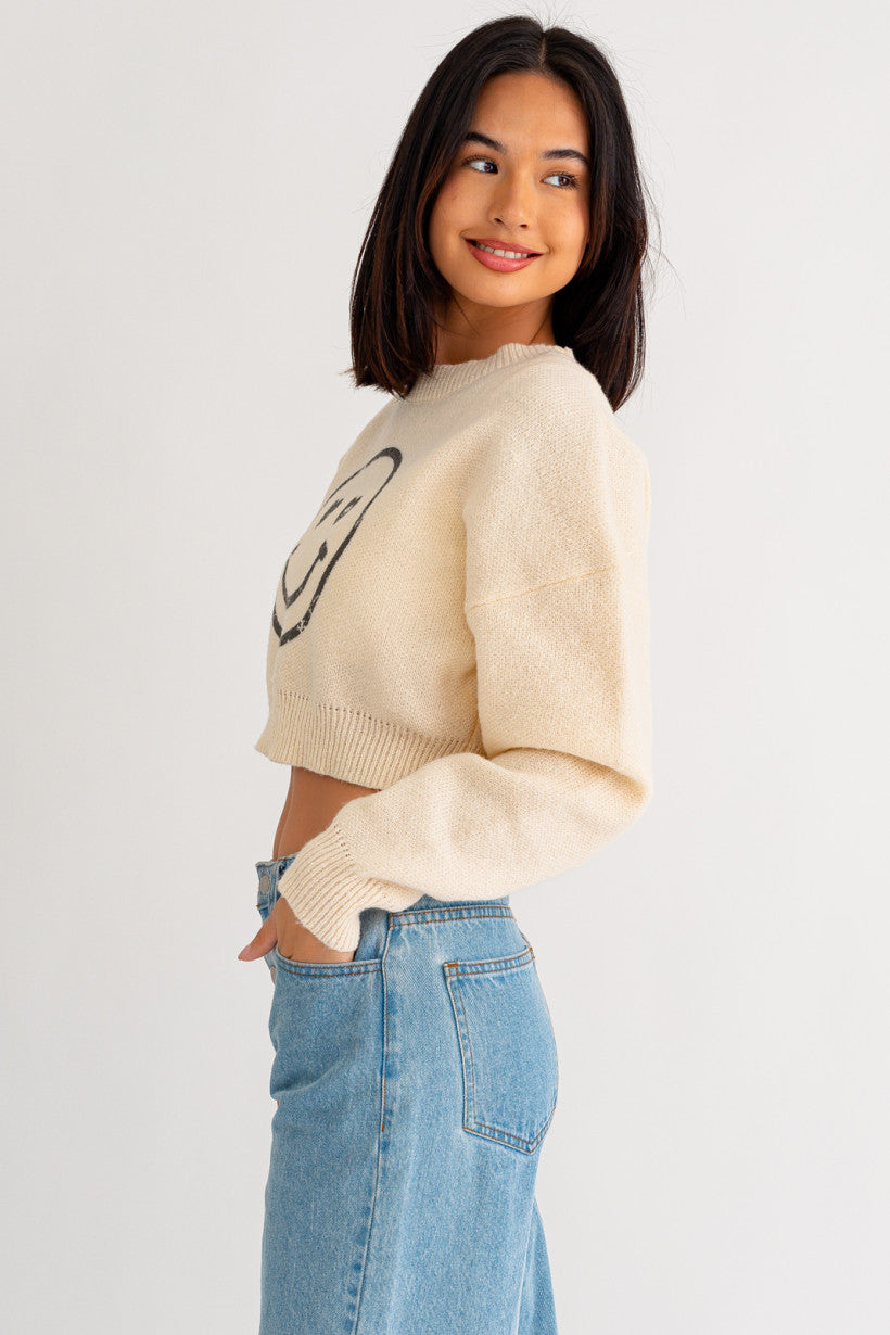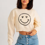 If you are looking for something cozy but stylish look no further, this smiley face crop sweater is just what you need! This sweater is soft to the touch and is made with recycled yarn!