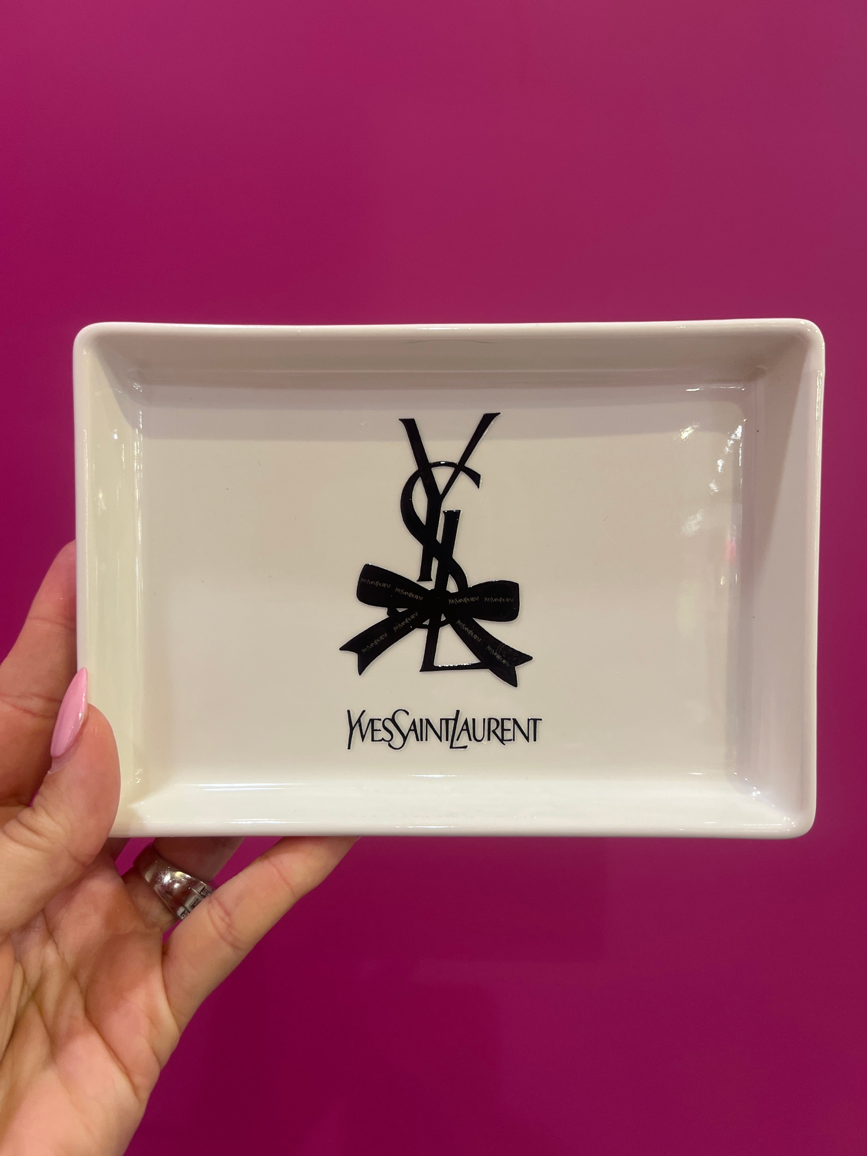 The YSL Bow Tray is a stylish, elegant piece that adds a dash of chic sophistication to any room. With its sleek design and signature bow detail, this tray is both functional and fashionable. Whether you're using it to display candles, or organize your favorite accessories, its clean lines and luxurious feel make it a statement piece that elevates any surface. Inspired by the timeless elegance of YSL, this tray brings a little touch of high fashion into your everyday life. Perfect for adding that extra flair to your home or gifting someone special!
